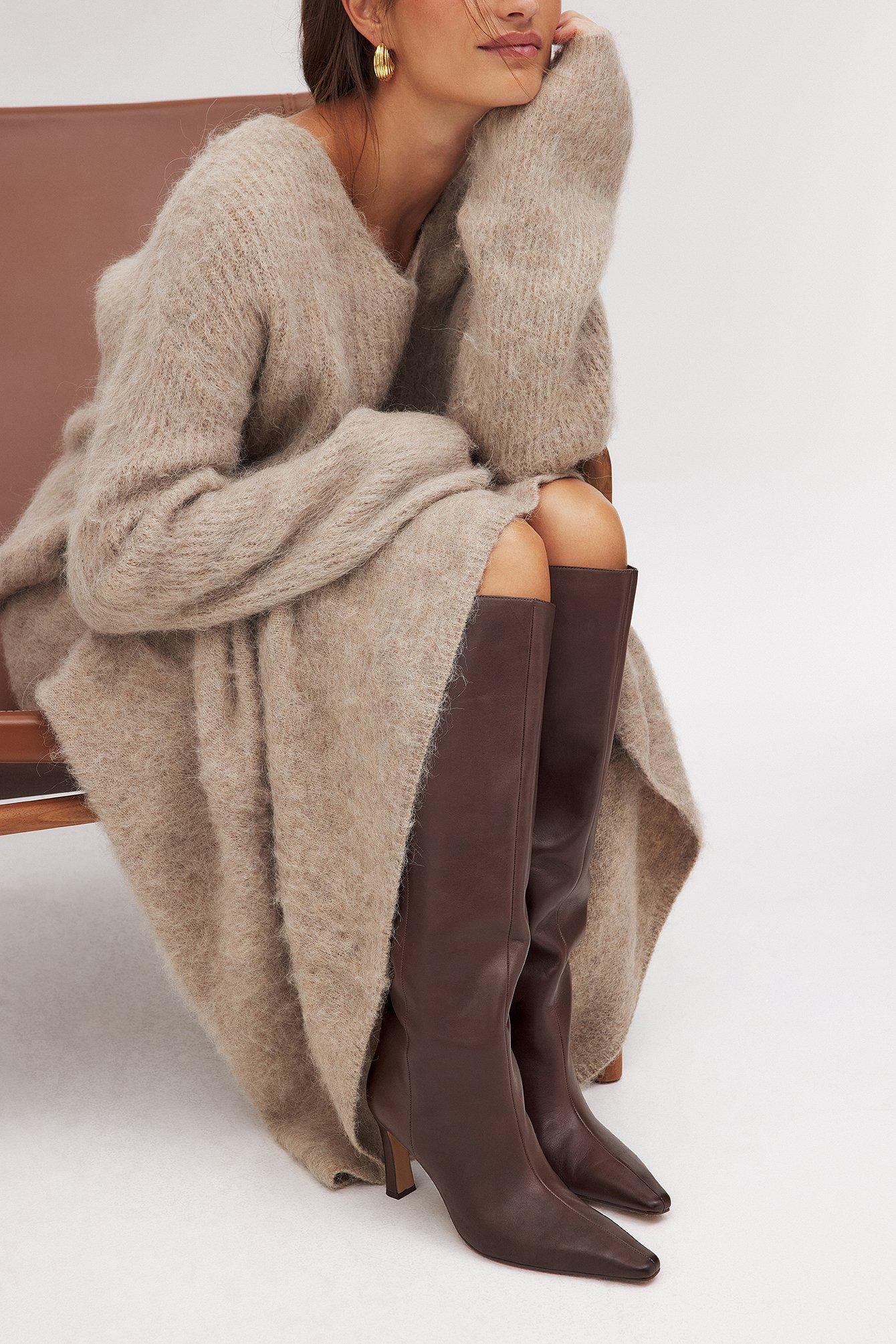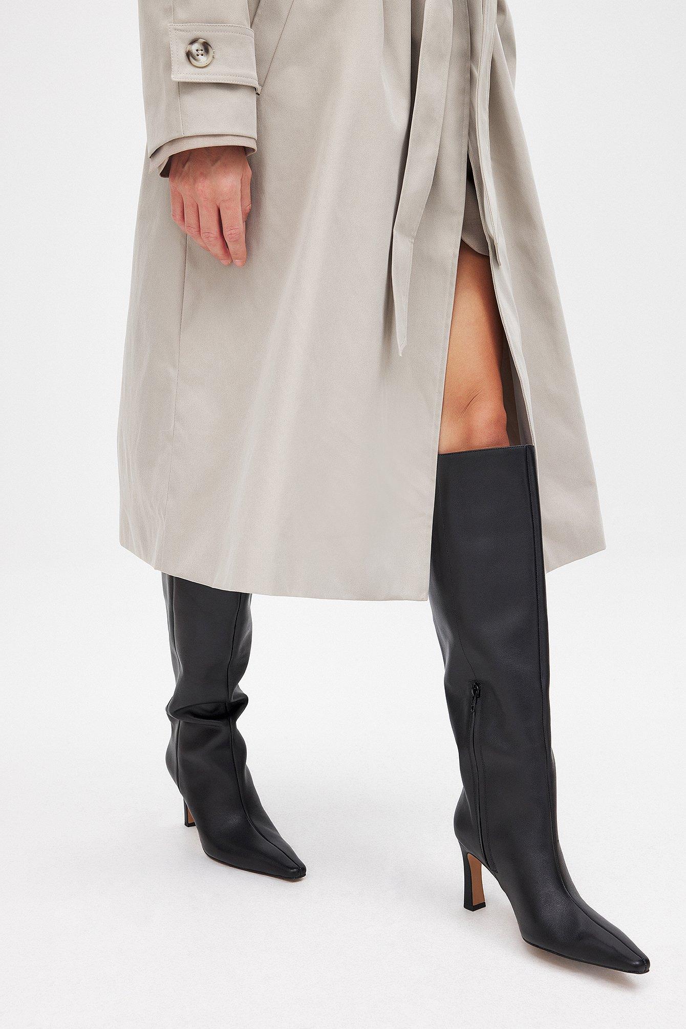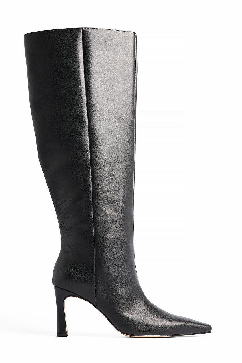 These boots are knee high and made of real leather and feature a slim fit and a pointed toe. They have a wide shaft and a squared heel. Our boots have a subtle side zipper closure at the bottom half. Measurements in size EU 39: Heel height: 8.5 cm / 3.35 in. Shaft height: 44 cm / 17.32 in. Shaft circumference around the calf: 44 cm / 17.32 in.
