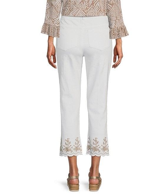 From Multiples, these jeans feature: Stretch denim fabrication Straight leg silhouette Belt loops 5-pocket styling Regular fit Embroidery with fringe edge Crop length Pull-on construction Approx. 26" inseam, 15.5 leg opening, 10 3/4" front rise, 16 1/4" back rise Cotton/spandex Machine wash/tumble dry Imported.