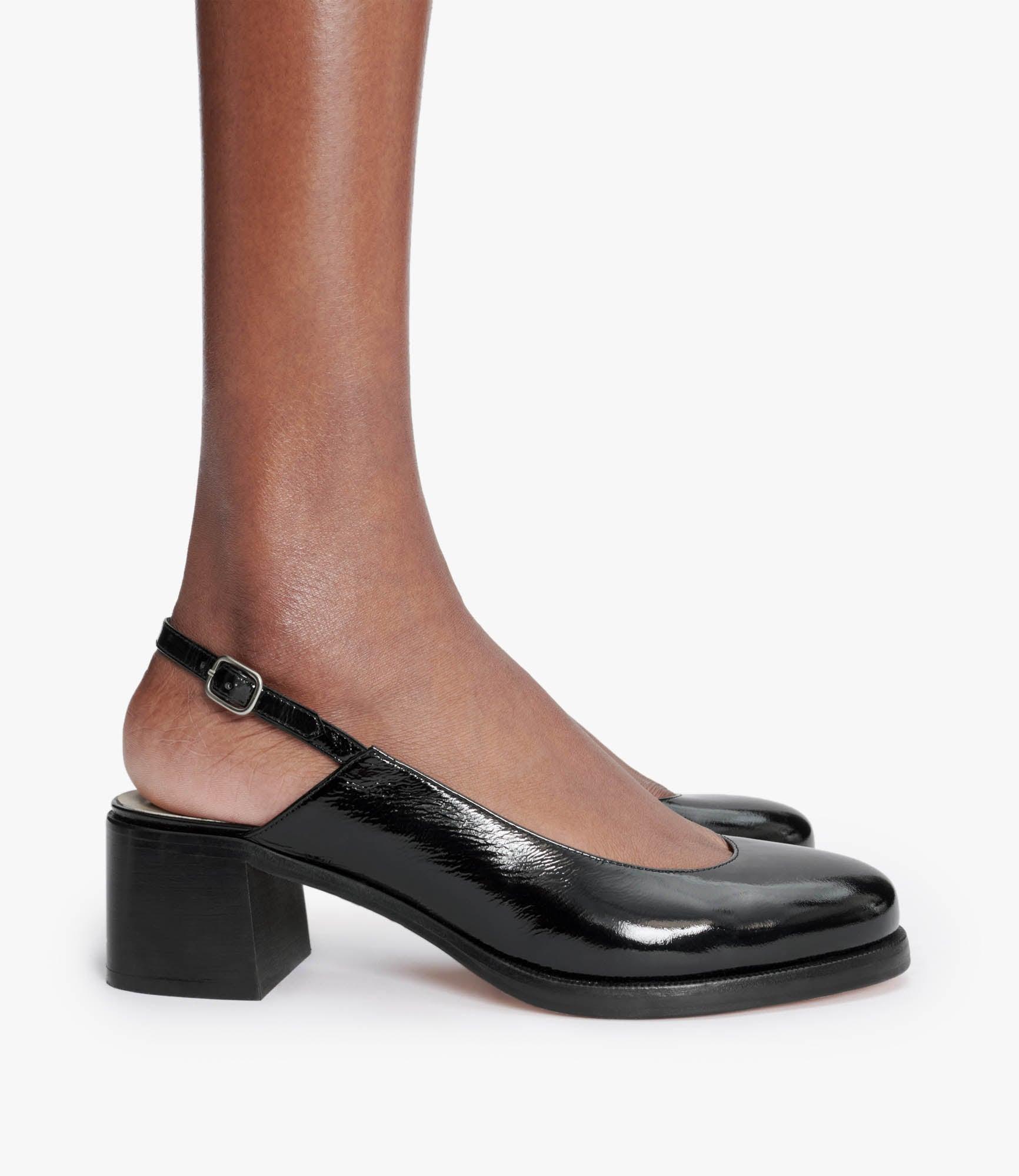 - Shoes in crinkled patent leather. - Strap adjusts with a metal buckle at the heel. - Smooth leather insole.