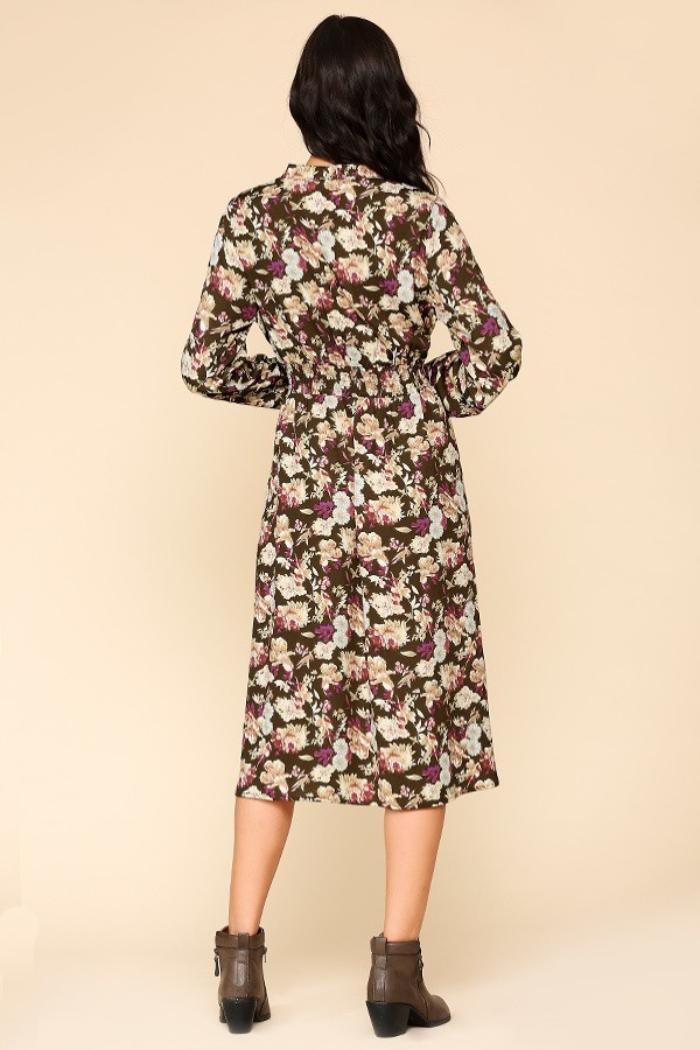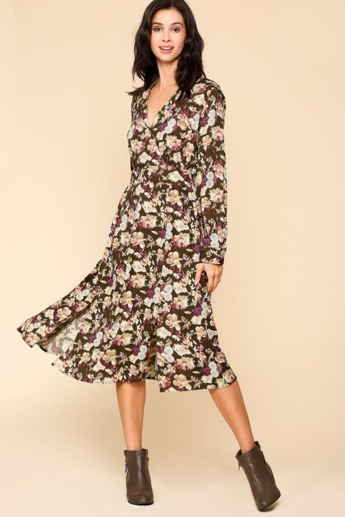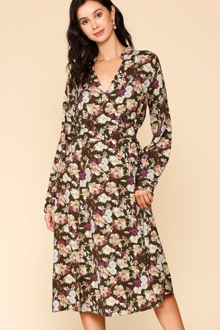 Fall is finally here and you need a nice season wardrobe! This beautiful transitional dress features a mix of floral prints all over the navy blue color, front bottom legs slits, front surplice V-neckline, long sleeves with buttons cuffs, smocked stretch waist back for easy wear, midi length, unlined, material has stretch. Wear it with suede leather ankle boots for the Autumn season! Also available in Blue color. Model is 5'8" and wears size Small L: 44" B: 20" W: 16"