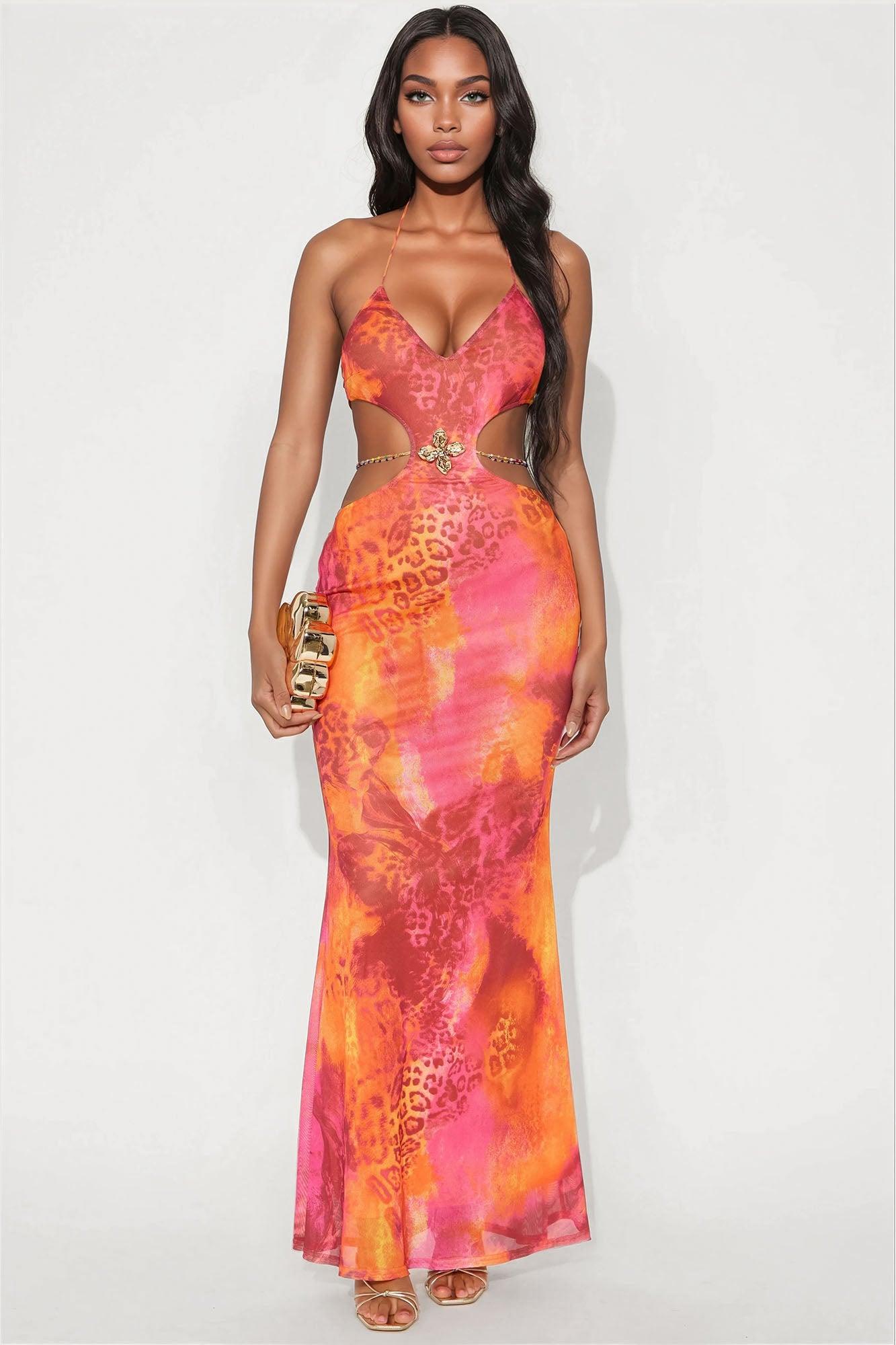 Available In Magenta And Sage. Tie Dye Mesh Maxi Dress Halter V-Neckline Cut Out Hardware Detail Tie Back Backless Lined Stretch Disclaimer: Due To The Specialized Dye Process, Each Garment Is Unique. Self: 90% Polyester 10% Spandex Lining: 100% Polyester Imported California Proposition 65WARNING: Cancer and Reproductive Harm - www.P65Warnings.ca.gov.
