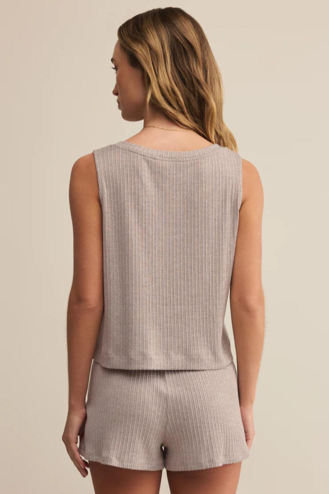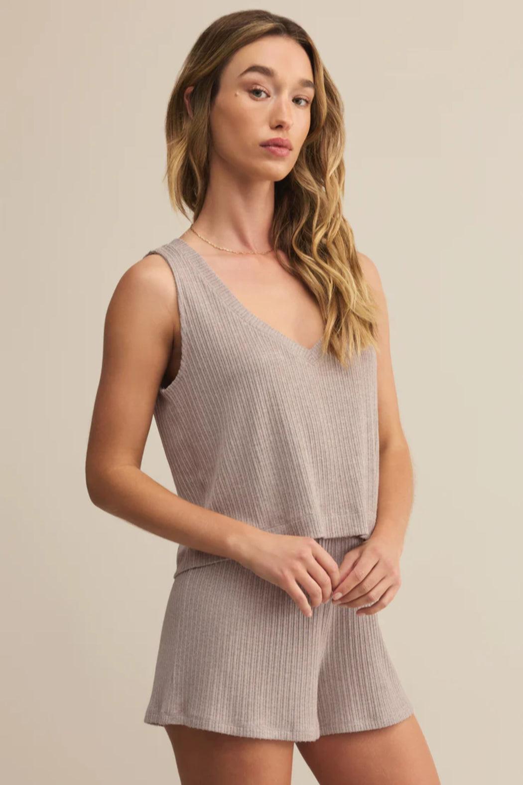 Designed for effortless downtime, this relaxed v-neck tank is made from our new Silky Mini Rib fabric for a lightweight, barely-there feel. Wide straps and a drapey fit keep things easy whether you're layering or lounging.