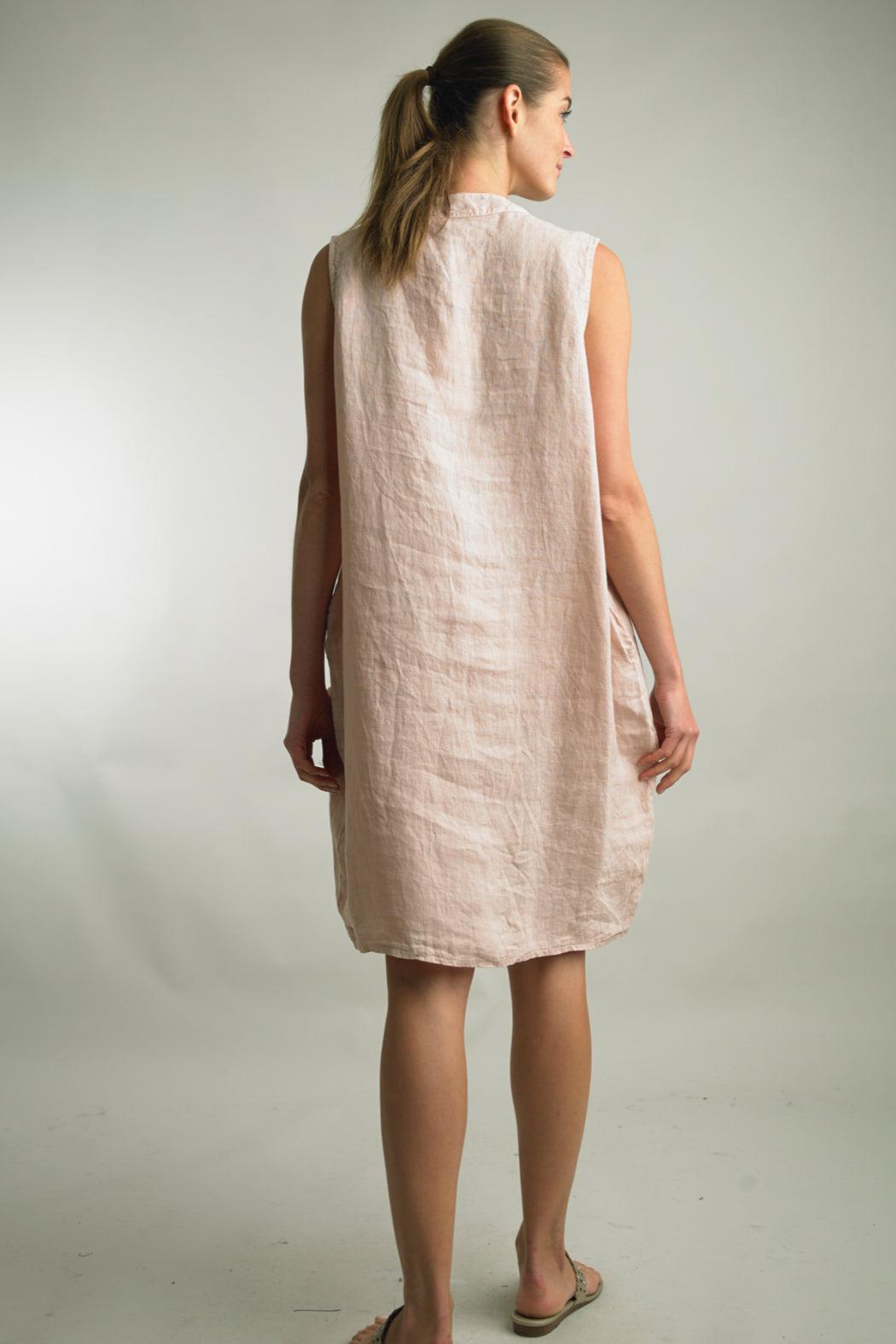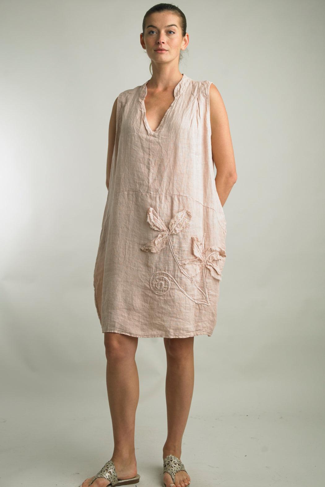 SLEEVELESS LINEN DRESS WITH LINEN FLORAL APPLIQUÉ ON FRONT