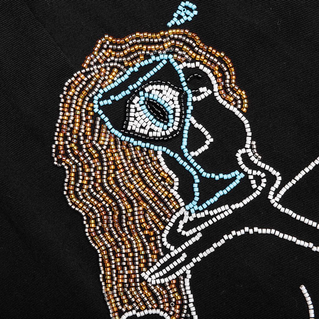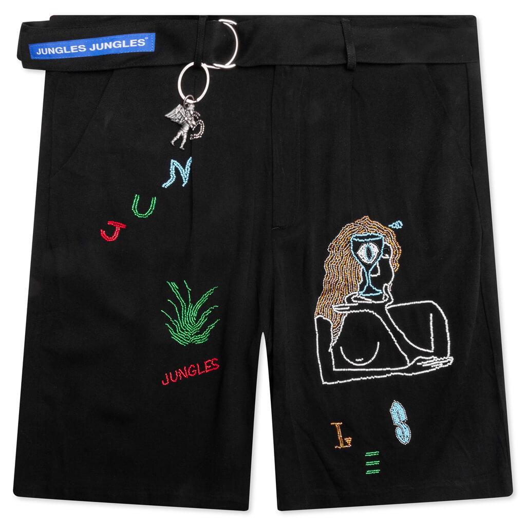 The Slow Down Beaded Short is the latest release from Jungles. Composed of a lightweight Tencel fabric, these shorts feature custom hand-beaded embroidery. A custom Jungles key ring at the belt loop adds to the overall detail. Finishing touches include the single pleated design, side seam pockets, and back welt pockets. Lightweight Tencel fabric Relaxed fit Belt loops Custom key ring Beaded embroidery Side seam pockets Welt pockets Style No: PLS-SDB-BLK