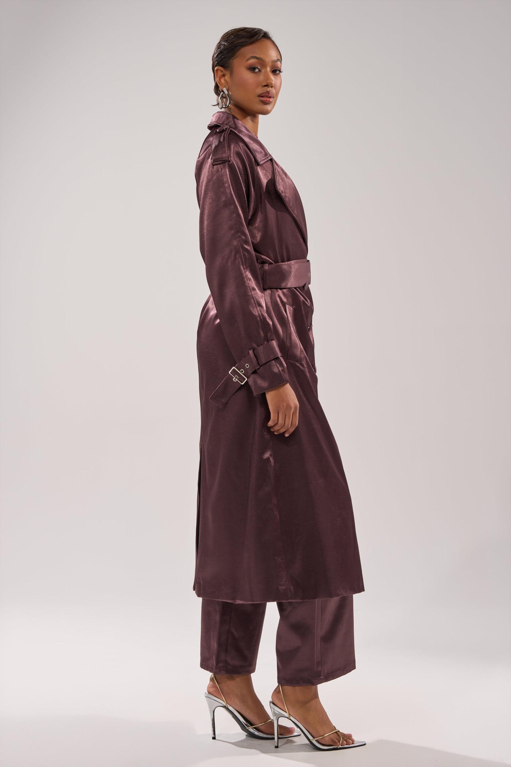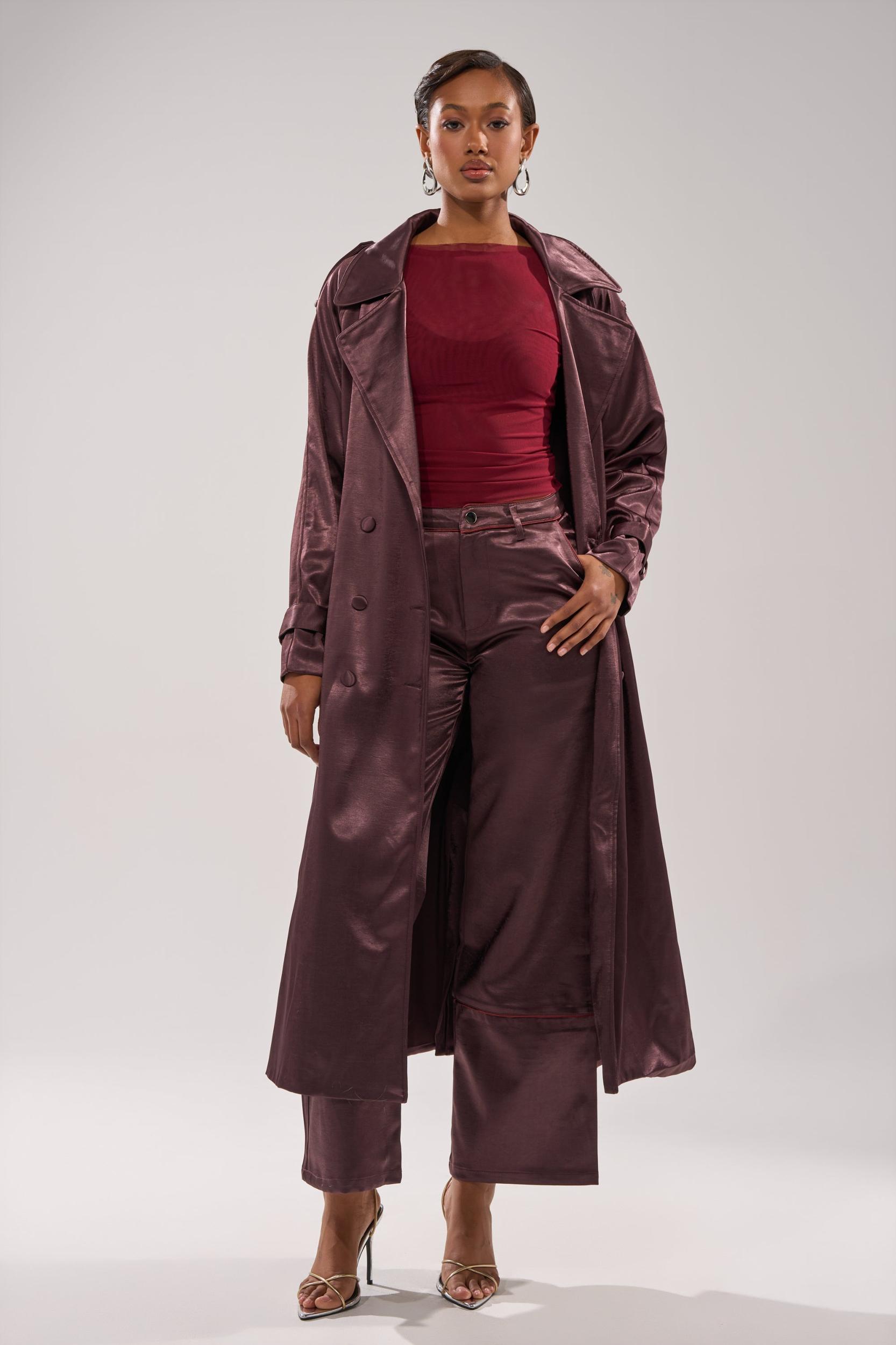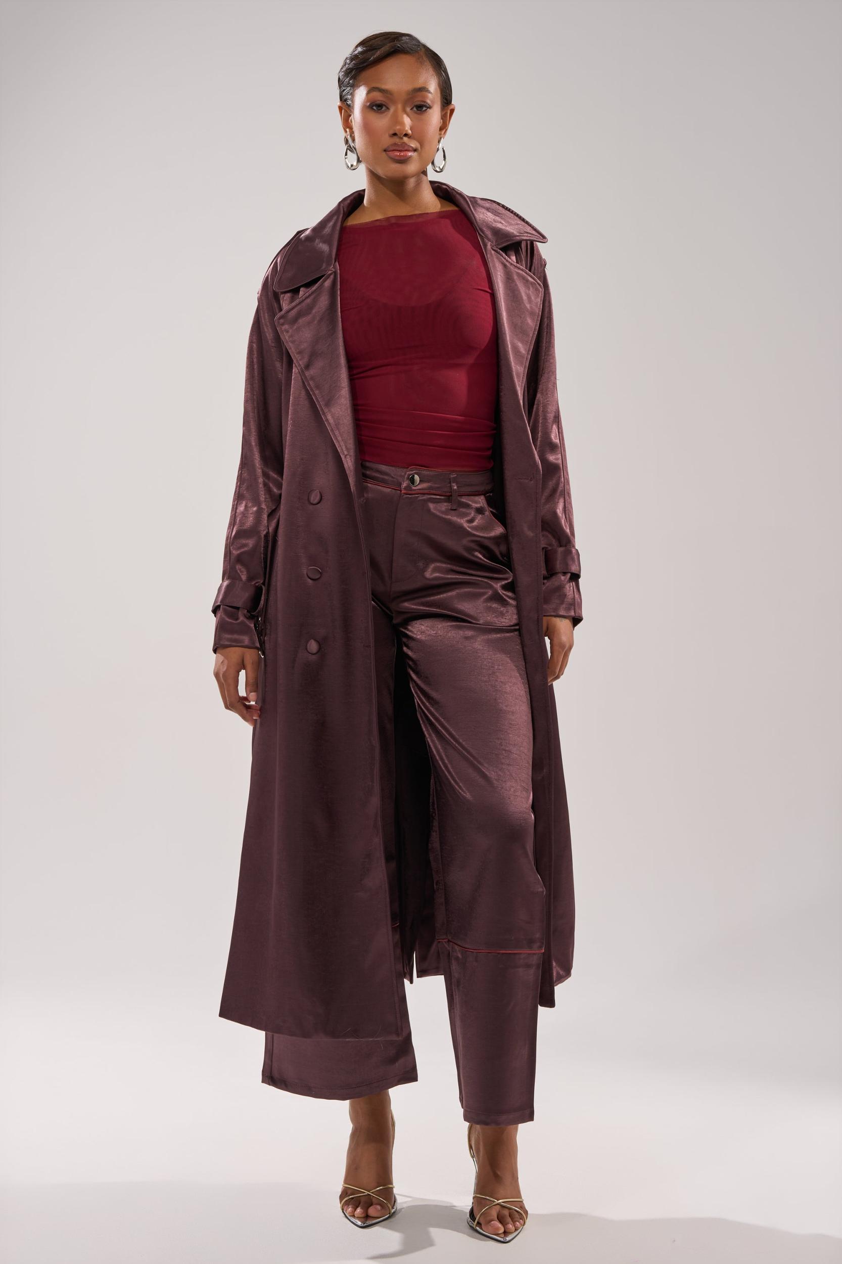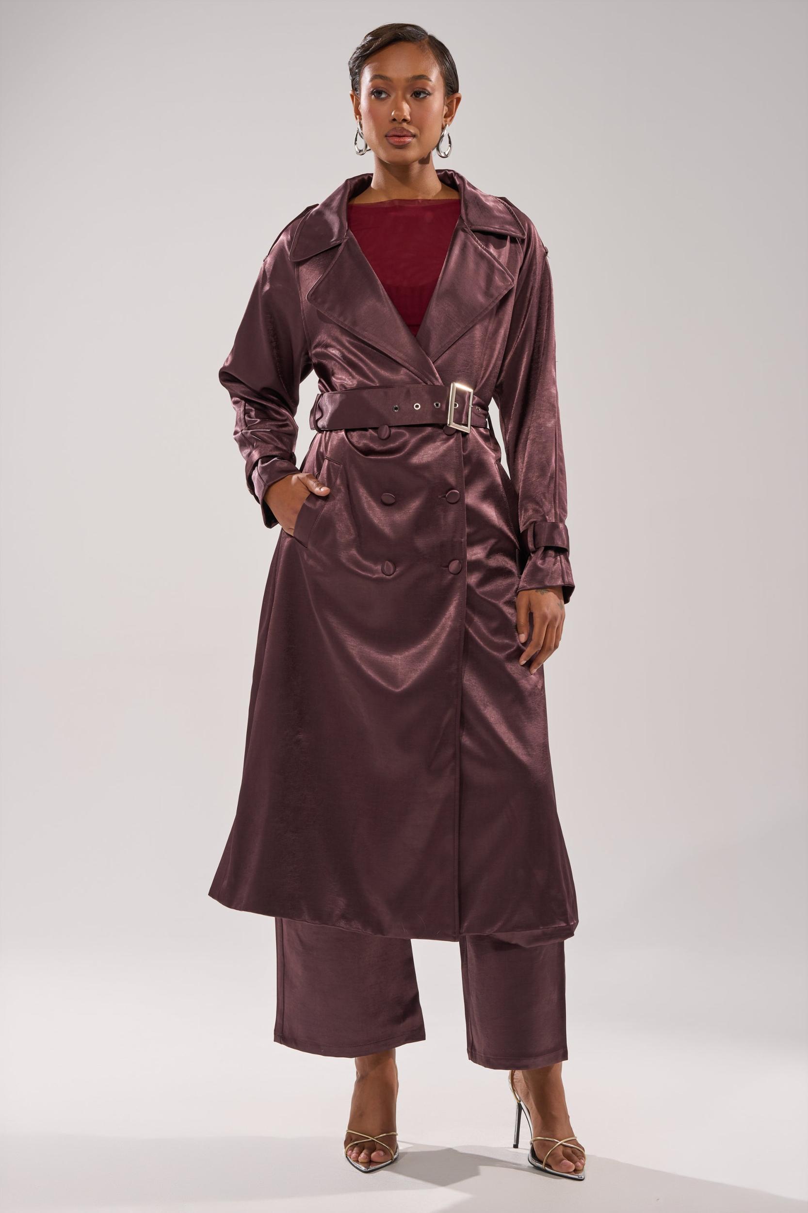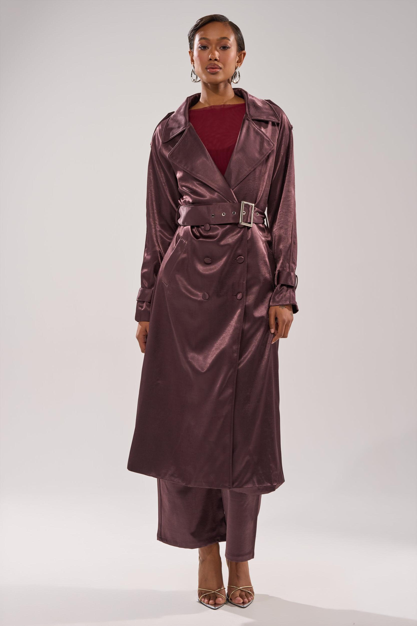 Relax and smell the roses in the AKIRA Label Slow Down Satin Trench. This luxurious outerwear piece is crafted from sleek satin with contrast piping on the hemlines. It features a classic notch lapel collar, shoulder epaulette detailing, long sleeves with adjustable belted cuffs, a coordinating waist belt, a double-breasted front closure, on-seam waist pockets, and a back vent slit. Complete with a classic, longline silhouette. Style it with the coordinating AKIRA Label Slow Down Satin Trouser, platform loafers, and oversized sunnies for an elevated finish. - 100% Polyester- Hand Wash or Dry Clean- No Stretch- Imported (all measurements approximate from size small)- 50” Shoulder to Hem- 18” Shoulder to Shoulder- 23” Sleeves - Model is 5’9” and is wearing size smallProduct ID: 1068693 (all measurements approximate from size 1X)- 53” Shoulder to Hem- 20” Shoulder to Shoulder- 24” SleevesProduct ID: 1068697