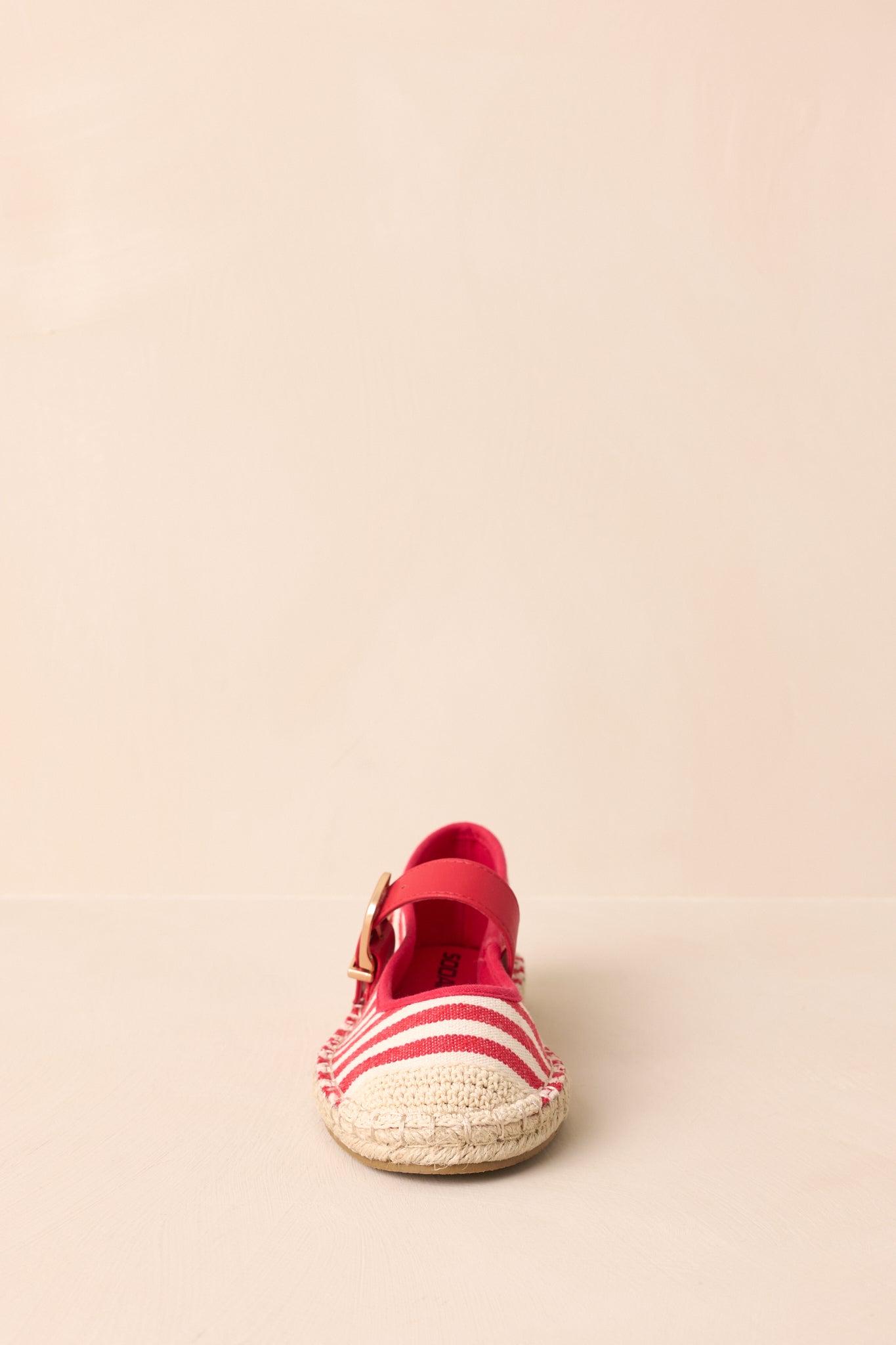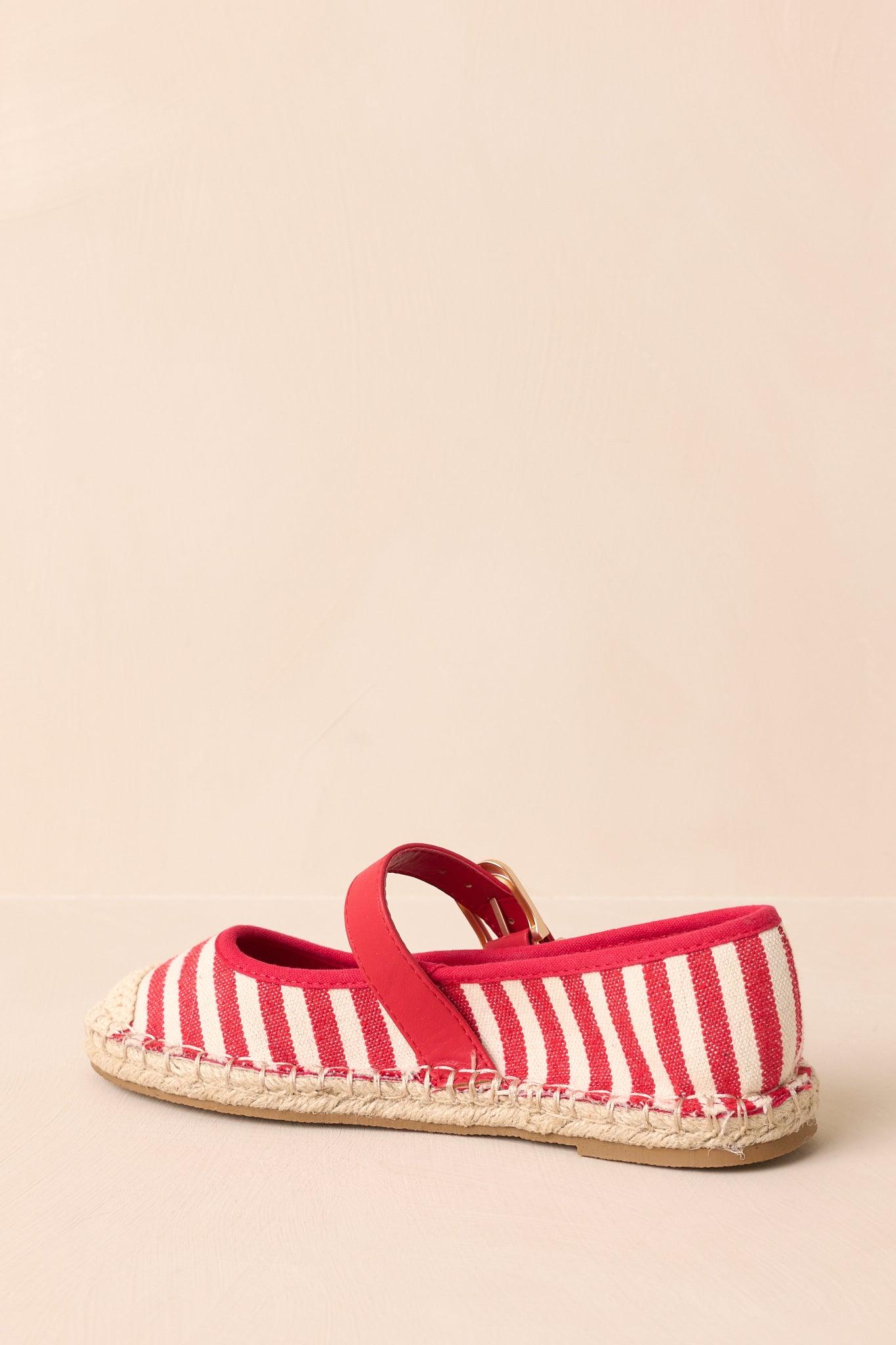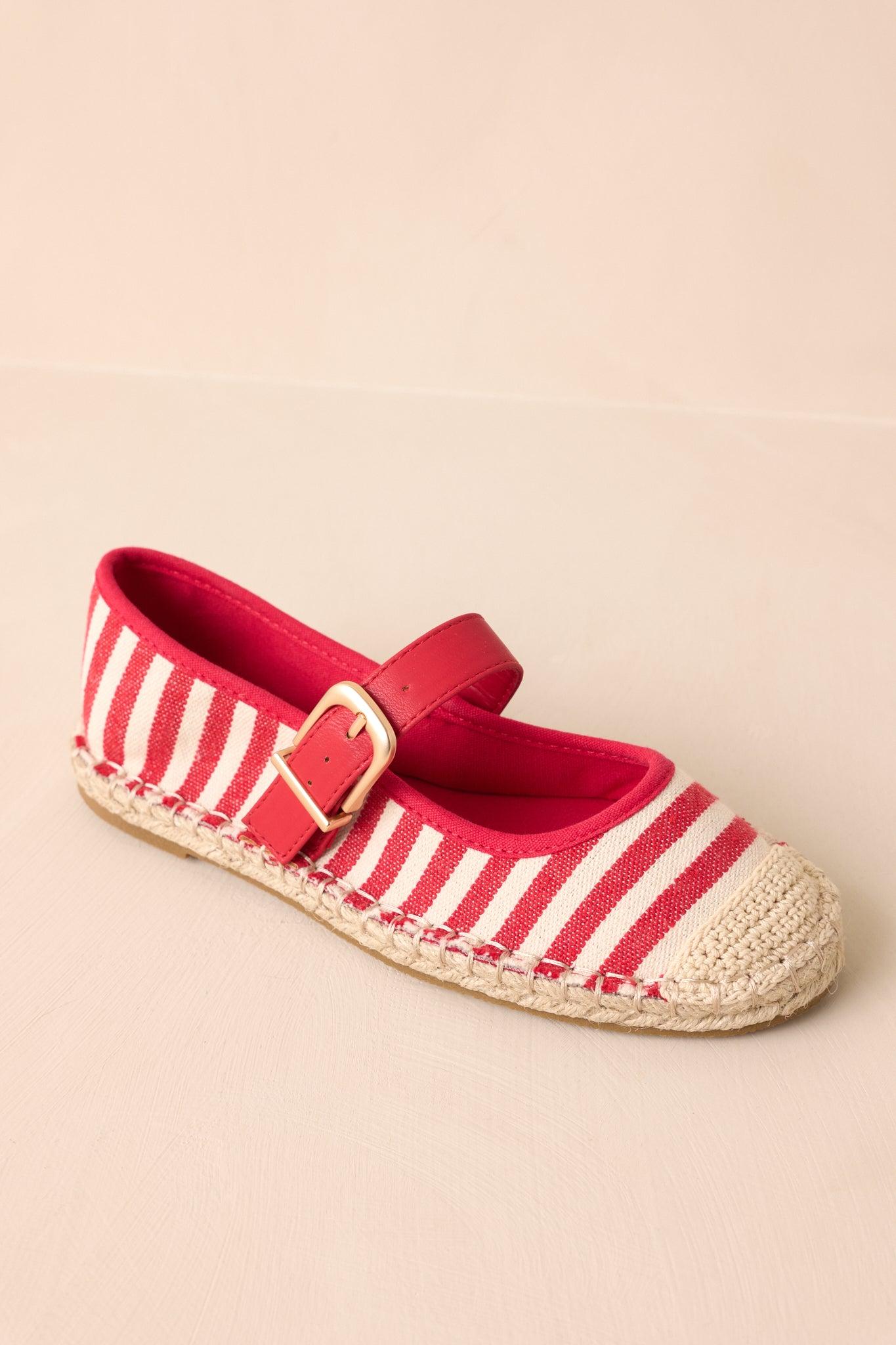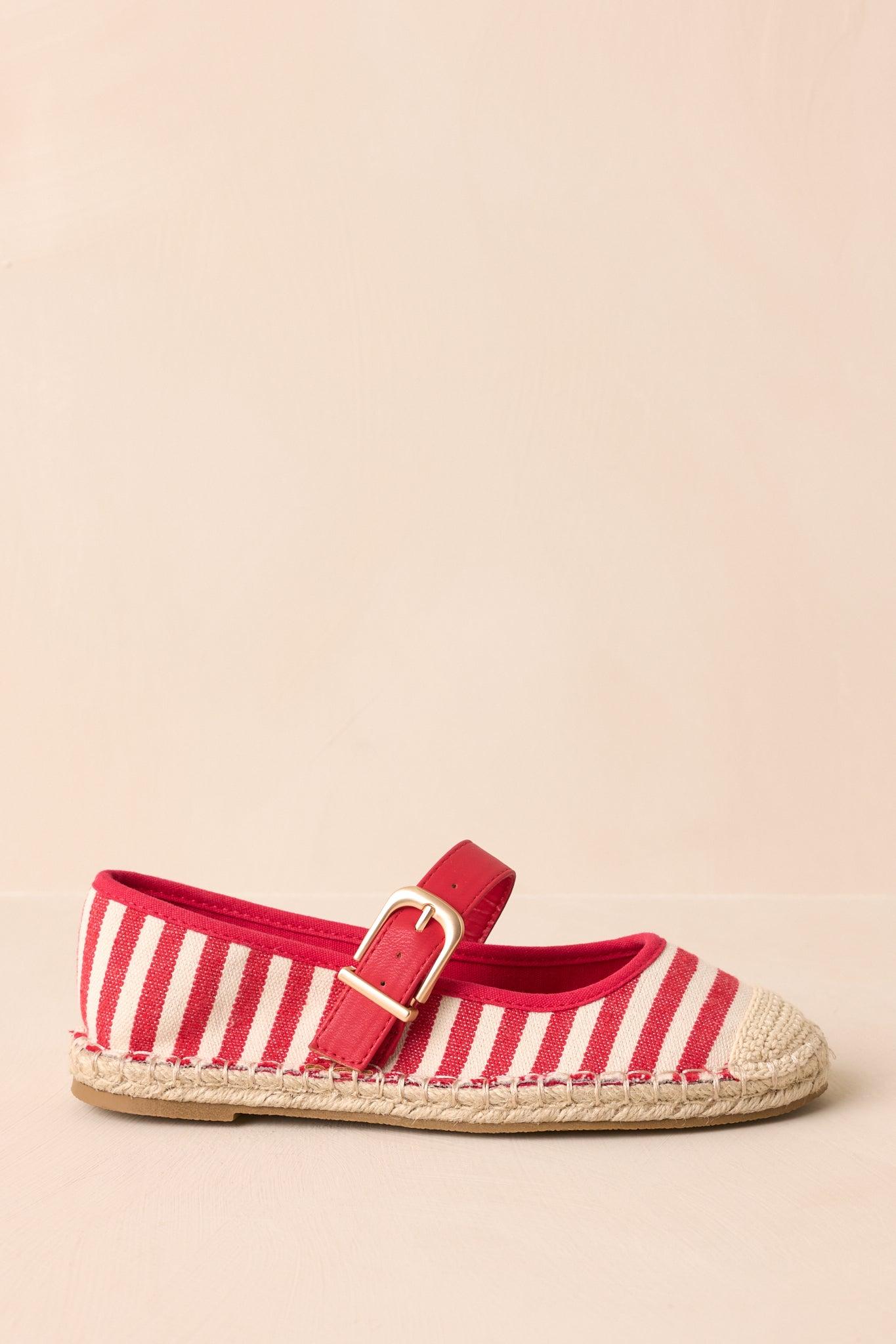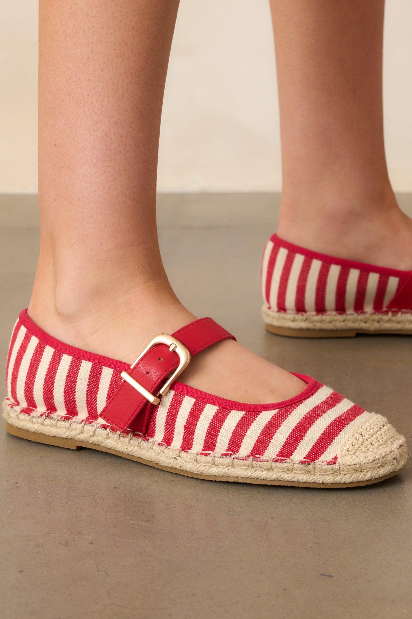 The Slow Living Red Stripe Espadrille Mary Jane Flats are a charming choice for embracing a relaxed, laid-back lifestyle. They're perfect for those moments when you want to feel carefree and stylish, with a sense of simplicity that encourages you to slow down and enjoy the moment. These shoes features an ivory and red stripe print, a canvas fabric, red interior, adjustable faux leather bar strap with a gold buckle, braided jute fabric trim on the sole, and a flat mary jane design. All Man Made Materials Non-skid sole True To Size Manufactured in China Designed in The USA