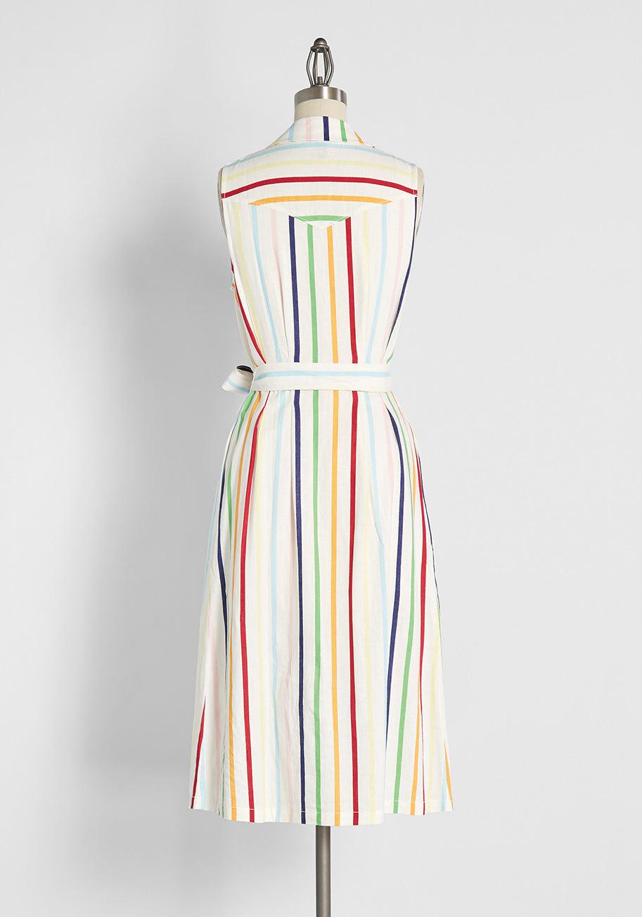 You’re going to want to live in this ultra-versatile, vintage-inspired ivory shirt dress from our ModCloth namesake label all summer long. With a retro camp collar and full button-front closure, this breathable, lightweight viscose-linen blend sleeveless dress boasts bold and brightly hued rainbow stripes all over and is great for keeping cool while looking minimally chic at work or at play. The oversized buttons add retro-fab flair while the removable sash tie-belt highlights the waist without compromising its timelessly flattering silhouette, and the handy side pockets at the hips are always a huge bonus.55% Linen, 45% Viscose.Hand wash.Side pockets. Unlined. Semi-sheer. Front button closure. Removable sash.ImportedFabric provides stretch.4=44 inches Length16W=46 inches Length