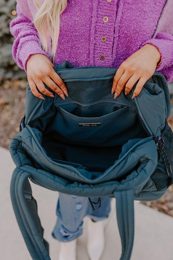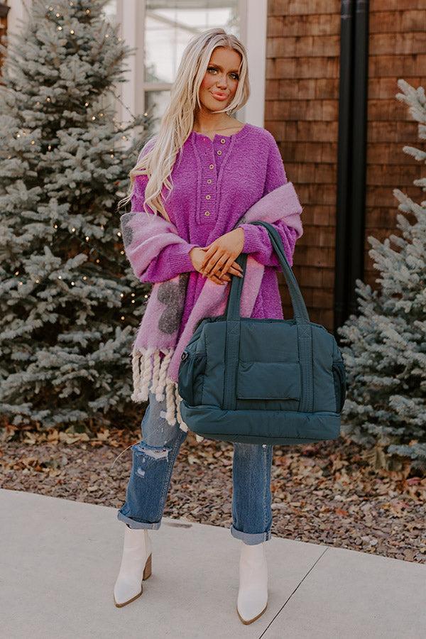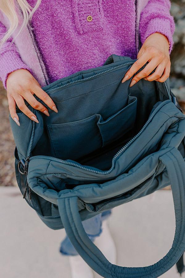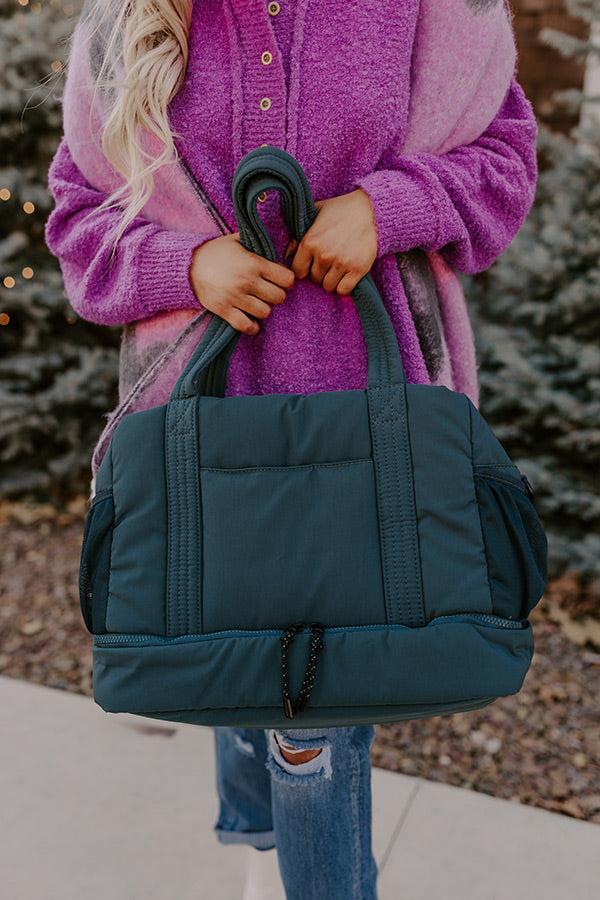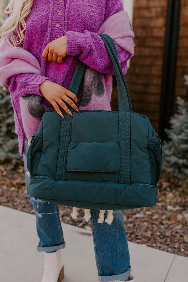 - Travel possibilities are endless with this trendy tote! - Sleek quilted material - Black plastic hardware - Three separate fully lined pouches (two with zip closure and one with zip closure) - Three additional interior pockets - Stretchy mesh side pockets on each side - An exterior button closure pocket on the front and a luggage sleeve on the back - A large double zippered bottom compartment - A detachable adjustable length shoulder strap as well as two shorter attached straps - A rectangular silhouette