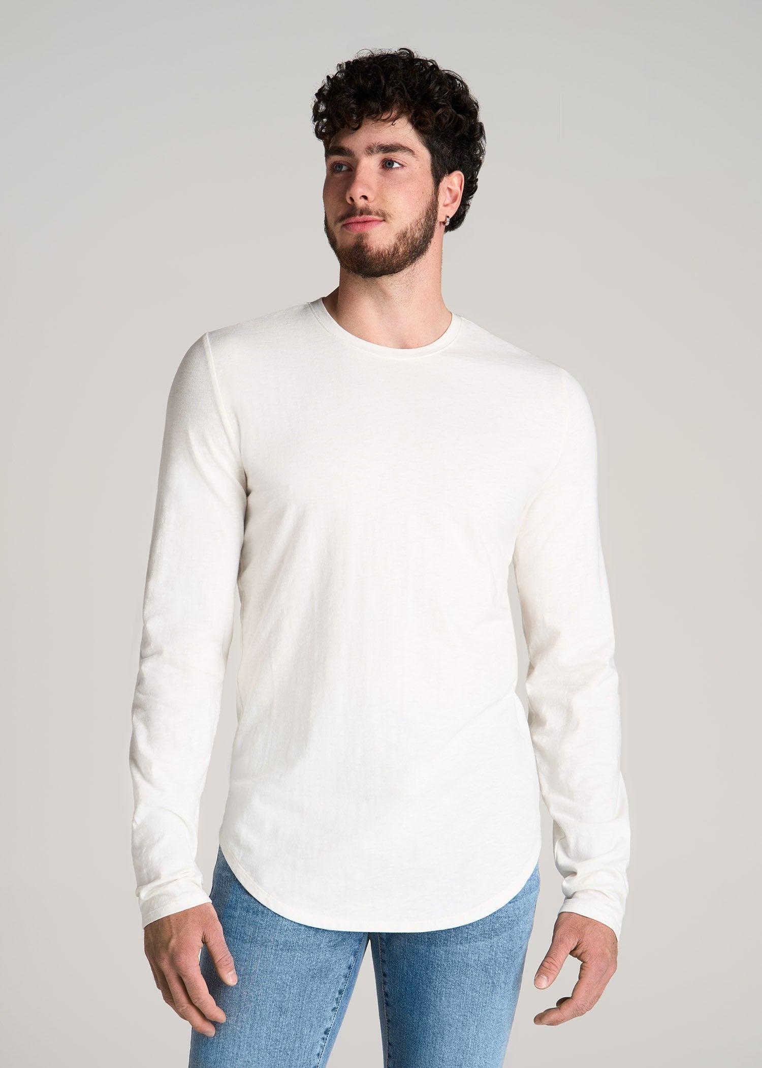 If you need to stock up on essentials, don’t miss out on this tall long sleeve shirt. It’s made with a stretch-infused cotton slub jersey that has a slightly textured yet supremely soft finish. The close fit is designed to sit next to the body and makes this an ideal layering or lounging piece. We made this extra long top with a scooped hem for a classic menswear feel that looks good on its own or under a sweater. This tee lands at the hip and has a self fabric crewneck for a polished finish. Our tall men’s tees are designed just for men from 6'6 to 7’1, so this top has extra long sleeves and a longer hemline. It’s also been pre-washed and shrinkage controlled to ensure the fit always stays perfect. This tee is offered in multiple neutral hues designed to be easy to wear and pair with any of your pants or slacks.