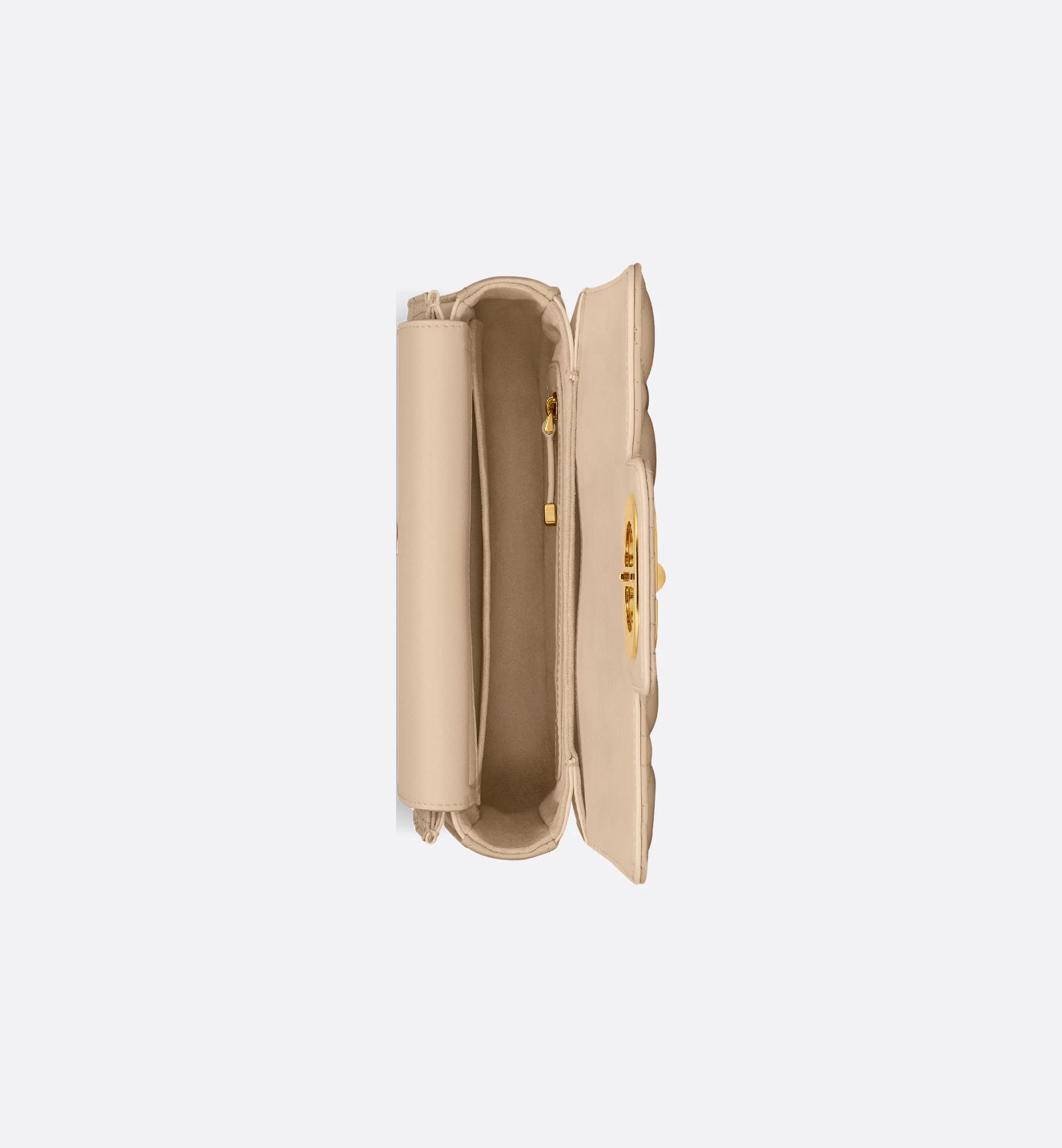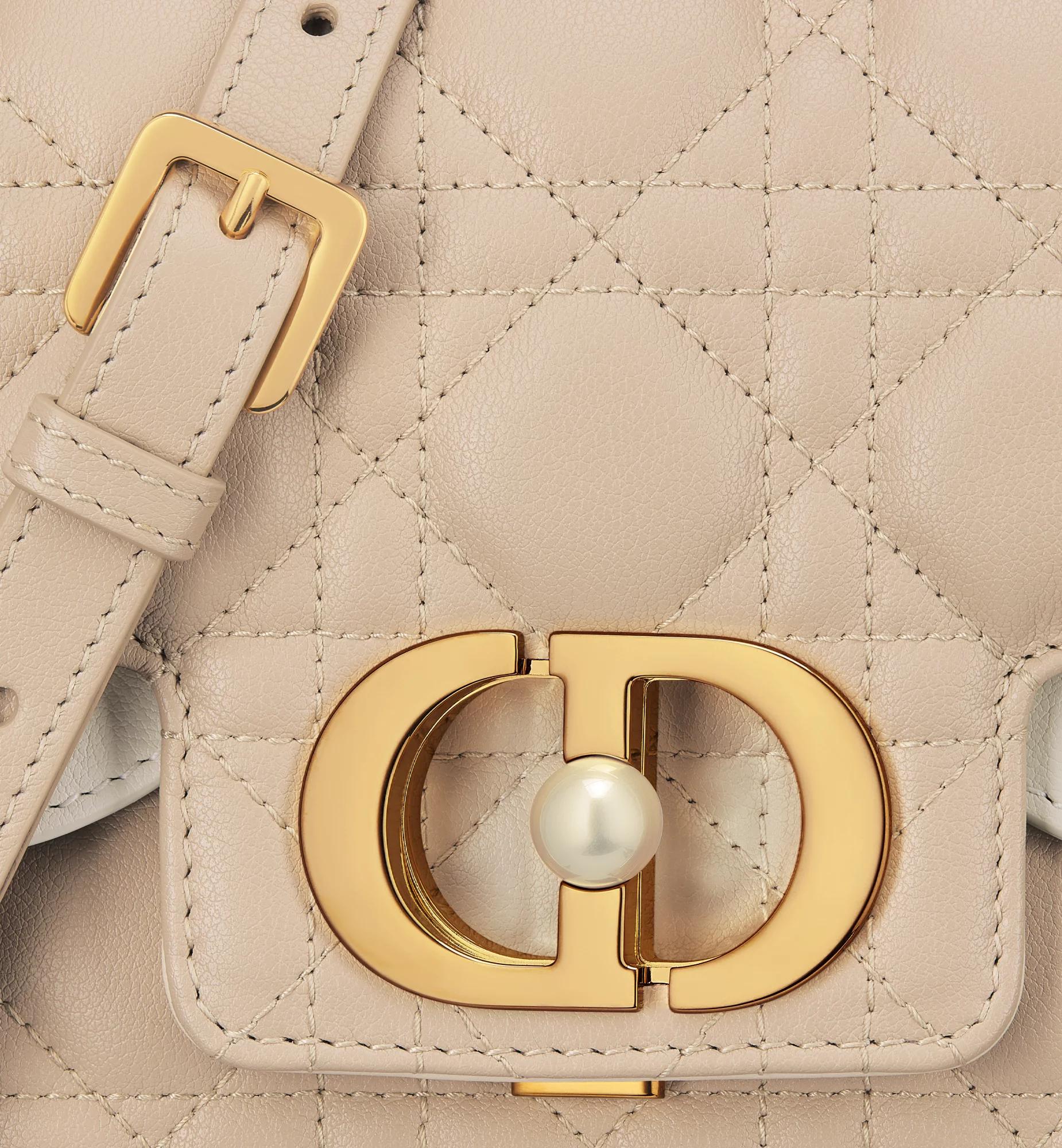 The Dior Jolie Top Handle bag presents an elegant and functional design. Crafted in two-tone calfskin with Cannage stitching, the dusty ivory bag features a powder beige double flap enhanced by a CD signature embellished with a white resin pearl, as well as three compartments and a zip pocket to accommodate all the essentials, day or evening. The removable top handle is completed by a detachable chain strap with a leather insert and CD signature links accented by white resin pearls, allowing the small bag to be comfortably carried by hand, worn over the shoulder or crossbody.