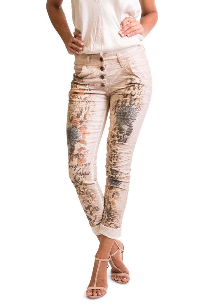 Gigi Moda - coastal lifestyle and effortless chic with a fashionable Italian flair. This jean features a 4-button fly with belt loops, front & back pockets and a slim leg. Made from a lightweight crinkle cotton stretch fabric in white with small flowers. Pair with your favorite tee and you're ready to go!