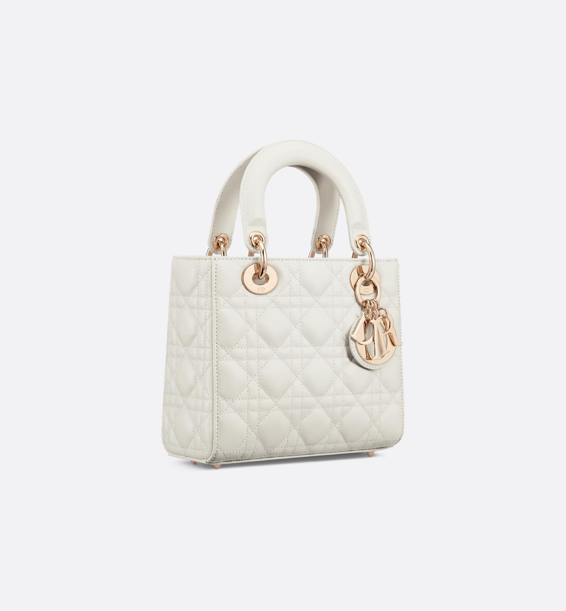 The Lady Dior My ABCDior bag epitomizes Dior's vision of elegance and beauty. Sleek and refined, the timeless style is crafted in latte lambskin with Cannage stitching, creating the instantly recognizable quilted texture. Pale gold-finish metal D.I.O.R. charms further embellish its silhouette with an elegant touch. Featuring a shoulder strap that can be personalized with badges, the small, unique design may be carried by hand or worn crossbody.