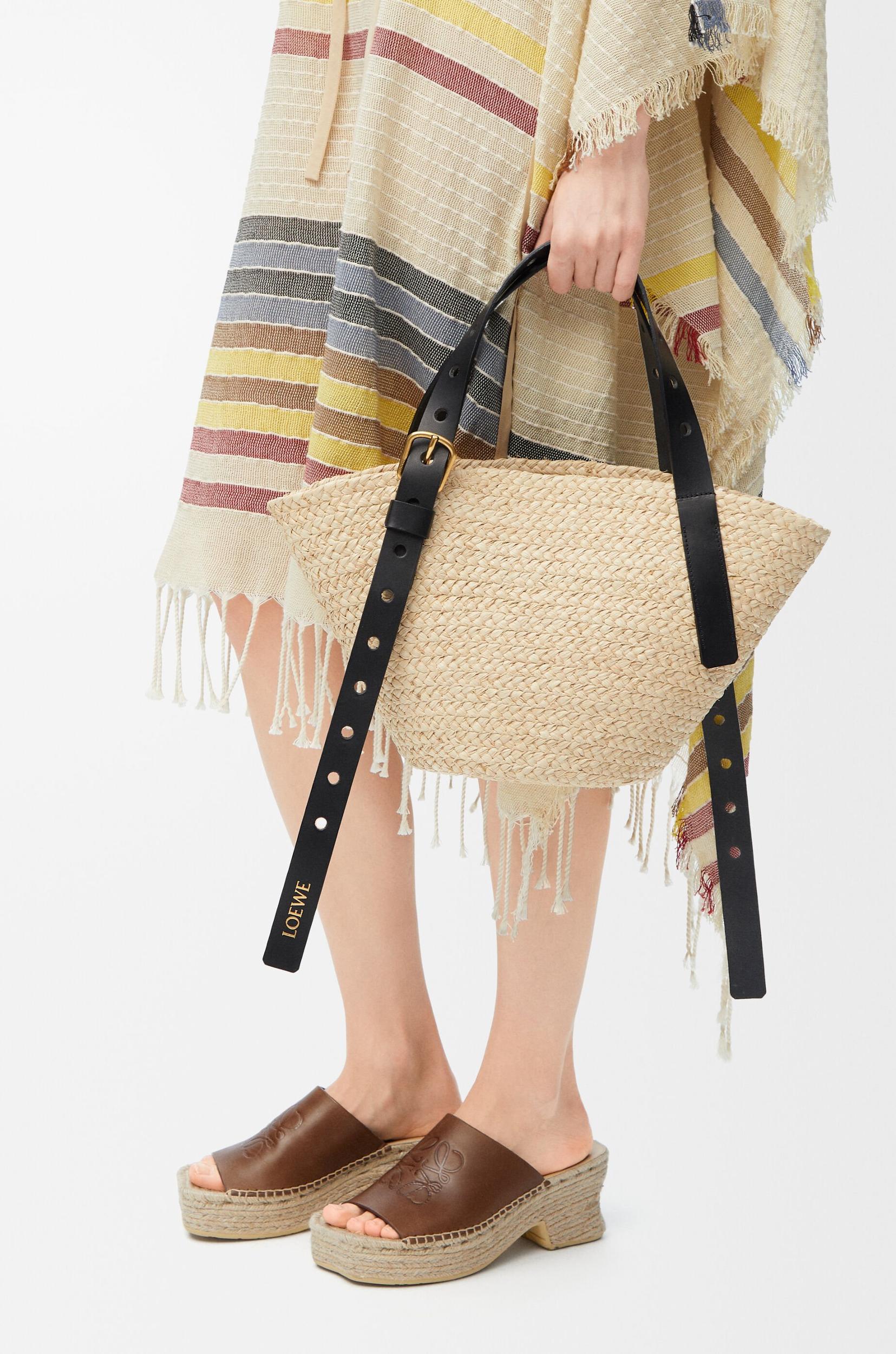 The Punch Hole basket combines a classic shape with raw edge belt handles and functional details. It is made in Spain using raffia palm leaves cultivated and handwoven by artisans in Madagascar. *Shoulder or hand carry *Adjustable handles *One internal calfskin pocket *Gold embossed LOEWE