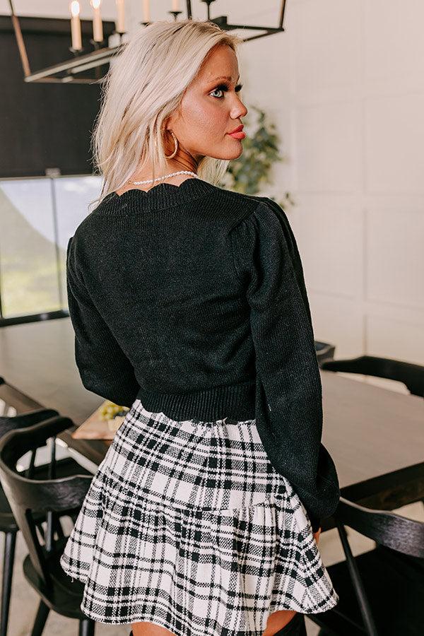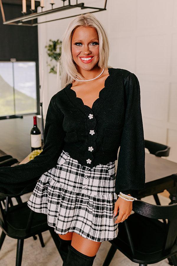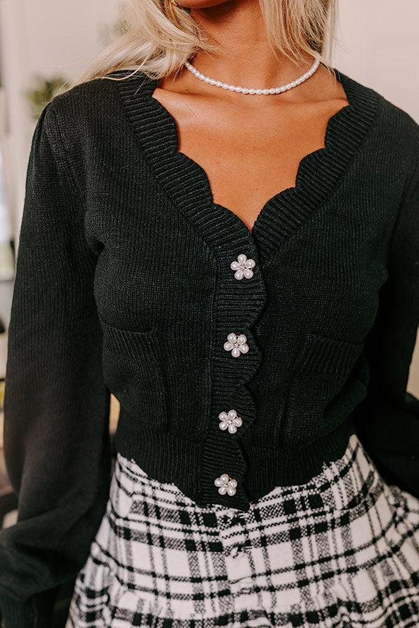 - Bring on the charm with this adorable cardigan! Whether you're headed to a casual brunch with friends or adding a sweet layer to a date night look, it is perfect for adding a pop of sparkle to your OOTD. - Unlined knit material - A scalloped v-cut neckline - A scalloped, buttoned front featuring faux pearl and rhinestone embellished flower buttons - Long, loose sleeves with ribbed cuffs - Functional low pockets - A relaxed silhouette that ends in a scalloped hemline