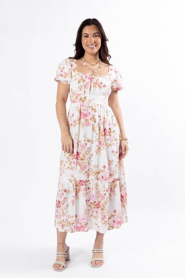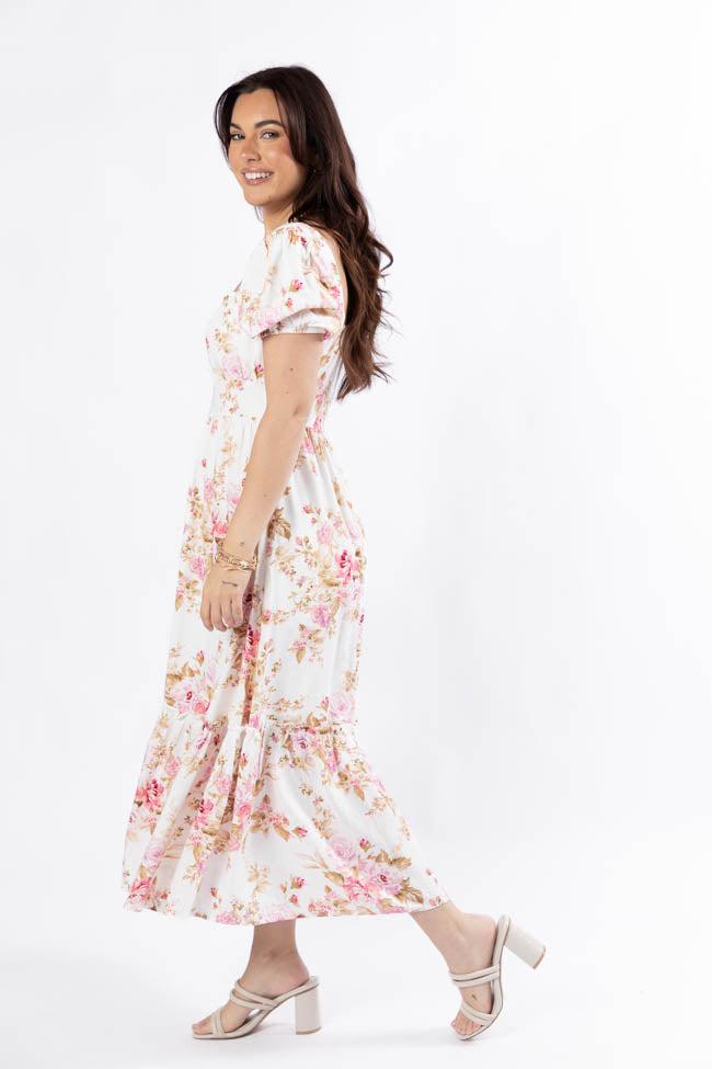 Details Floral Midi Dress Pink Multi Fabric does not have stretch besides in elastic Elastic neckline and sleeves, smocked back Lined Size small from shoulder to hem: 49" Material and Care Shell: 90% rayon 10% linen, lining: 100% polyester Hand wash cold, line dry Patterns may vary Materials may have natural variations Colors may vary from different viewing devices.