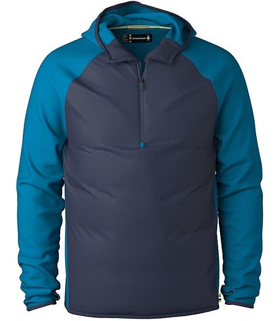 From SmartWool, this hoodie features: Color block detail Half-zip closure Long sleeves with thumbholes at cuffs Interior chest pocket Regular fit Four-way stretch fabric paneled in at key mobility zones Non-PFC DWR (Durable Water Repellent) and wind-resistant front panel, help to protect from the elements Moisture management Temperature regulation Odor resistant Main body: Recycled polyester/merino wool/elastane Front overlay: Recycled nylon Insulation: Recycled merino wool Lining: Merino wool/recycled polyester Machine wash/line dry Imported.