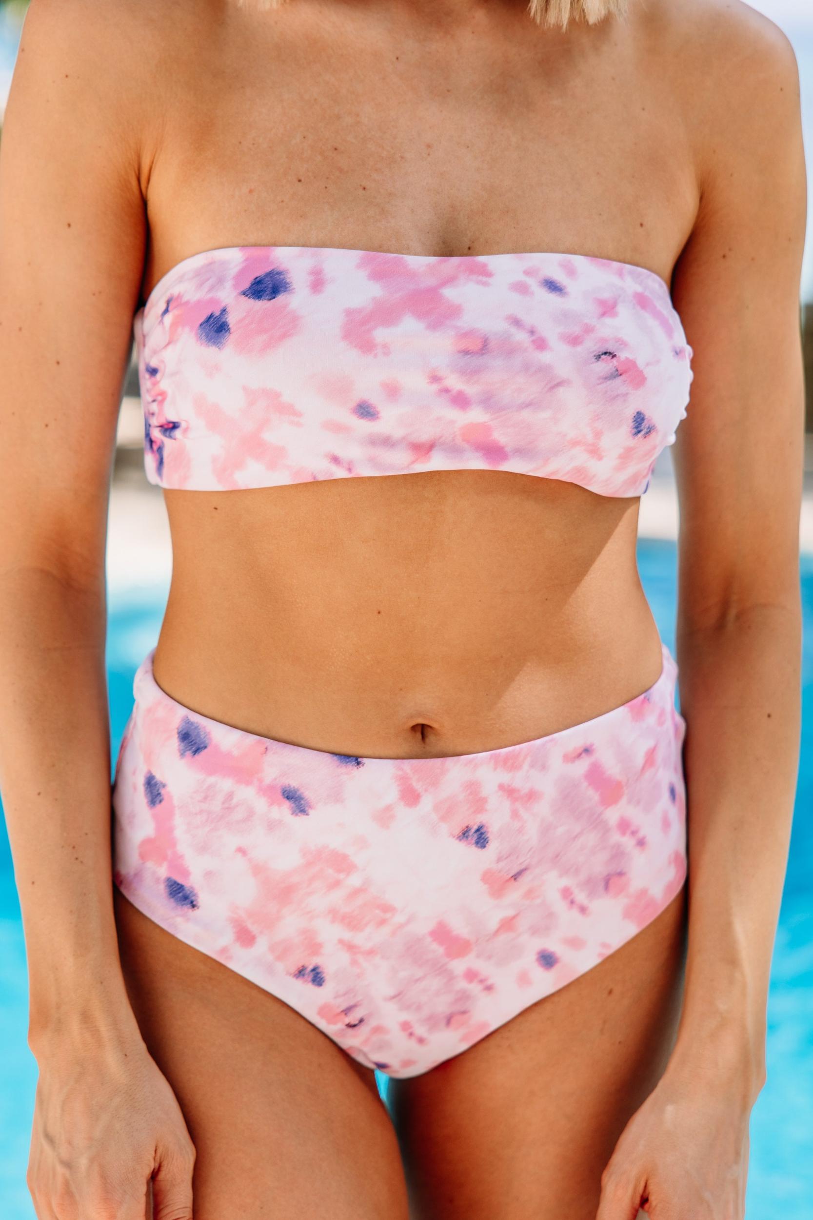 This bandeau bikini top is so cute! We love the simplicity of the style! The tie dye print is so cute too! This bikini top is going to look so good this summer with their matching bottoms! This bikini top features a strapless neckline, tie dye print, and removable padding. Small: Bust stretches from 25" to 29"Medium: Bust stretches from 27" to 31"Large: Bust stretches from 29" to 33"XLarge: Bust stretches from 31" to 35" Material has a generous amount of stretch.Cam is wearing the small.