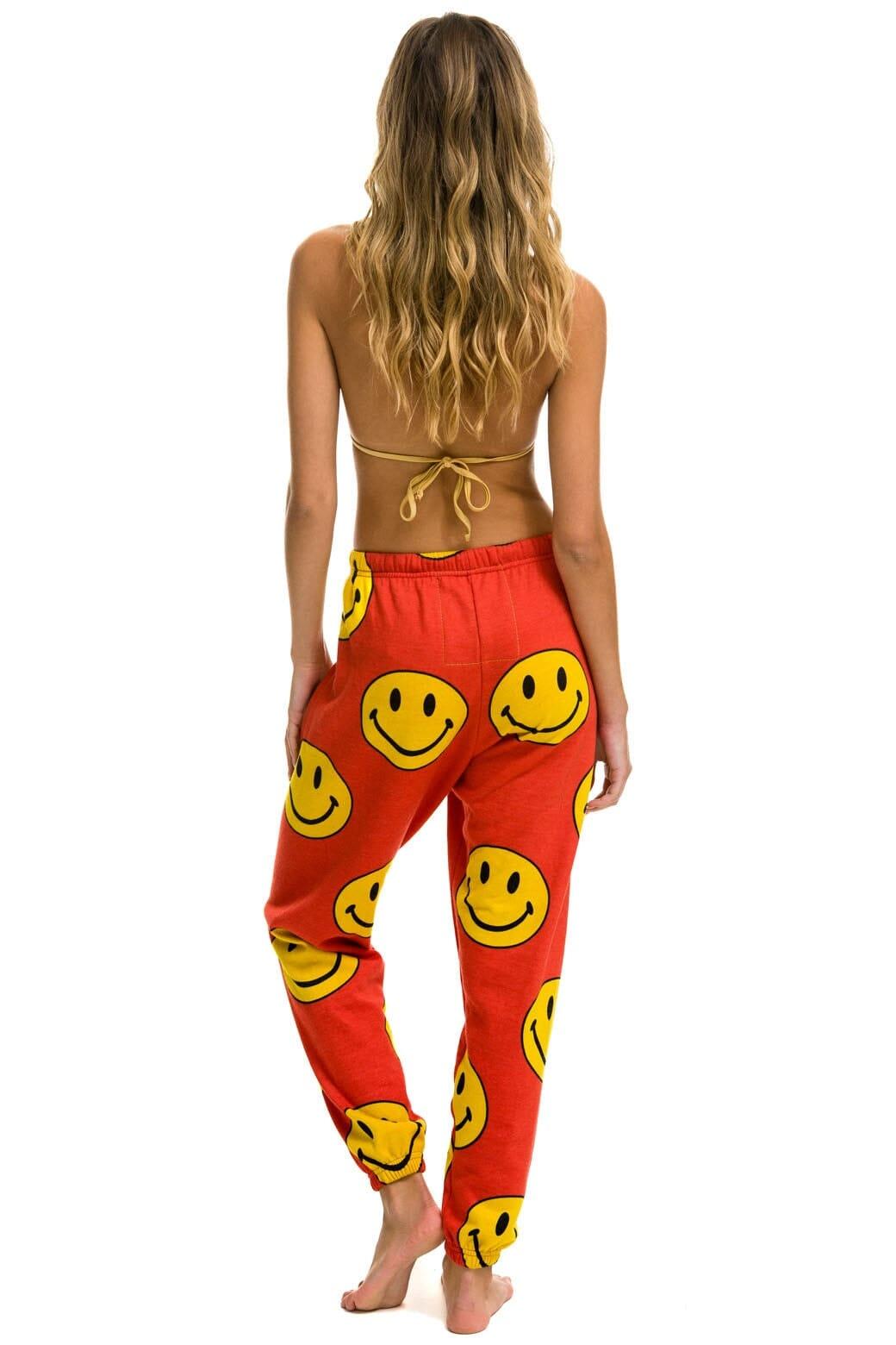 Our classic smiley repeat is back and better than ever! Don't forget the matching hoodie to achieve full rockstar status. The most comfortable sweatpants you'll ever own. Our single needle stitch work gives each garment a unique, one of a kind effect. All of our products go through an intense breaking-down process that gives them a vintage feel you'll love because it's broken in from day one of wearing it. You're going to live in these sweats. - Model wearing size XS- Hand sewn in our own factory in the heart of Los Angeles- Tri-Blend Fabric: 50% polyester, 38% cotton, 12% rayon- Machine wash cold with like colors. Hang or tumble dry on low