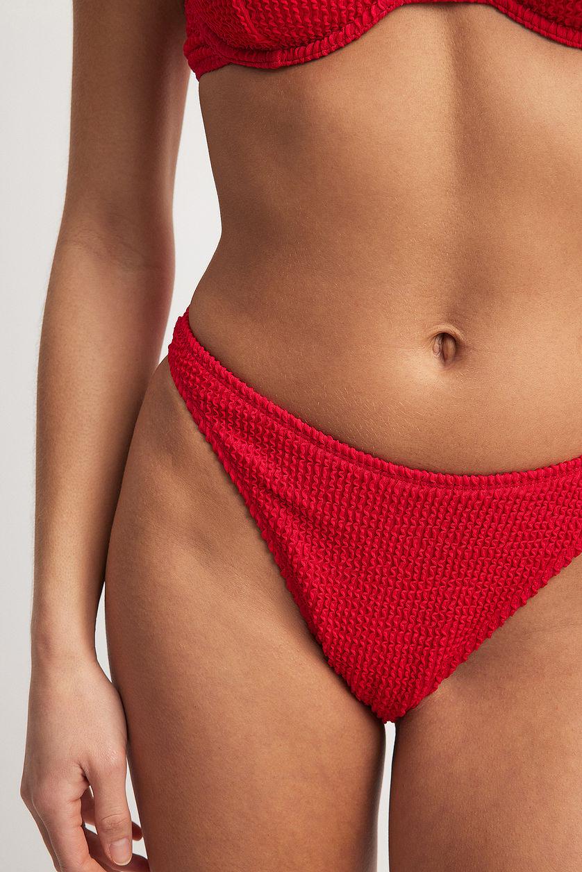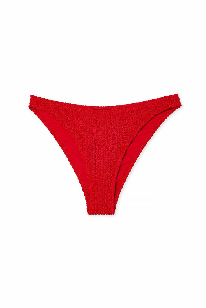 This bikini panty features a high cut leg and a smocked design. It has a stretchy material and a lining.