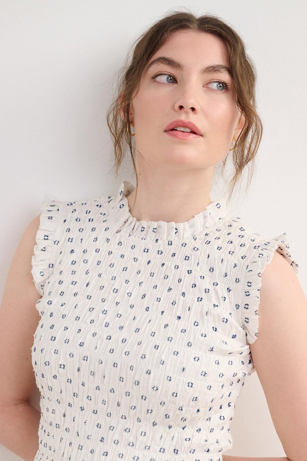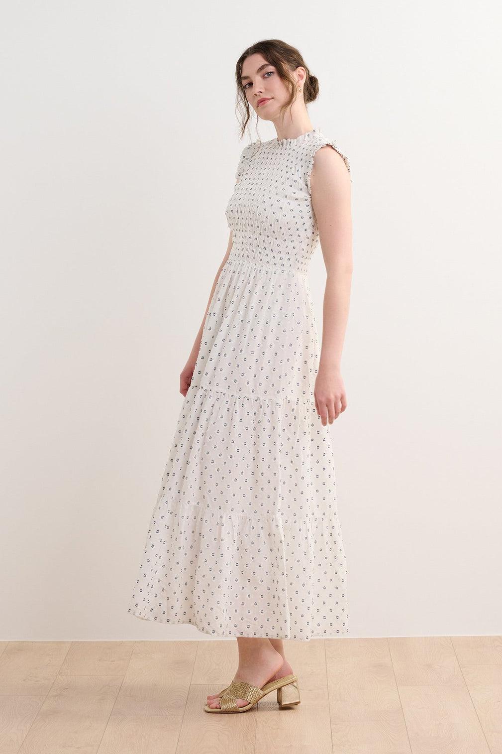 The Smocked Maxi Dress in Navy Spots is an elegant yet comfortable fully-lined option for special occasions. Made from a blend of viscose, polyester, and nylon, this fully lined dress features a smocked bodice for a flattering fit, a ruffled neckline, a three-tiered skirt, and a flowing silhouette. The playful spotted design in navy tones adds a modern edge. Style it with heels or sandals for a chic, effortless outfit.