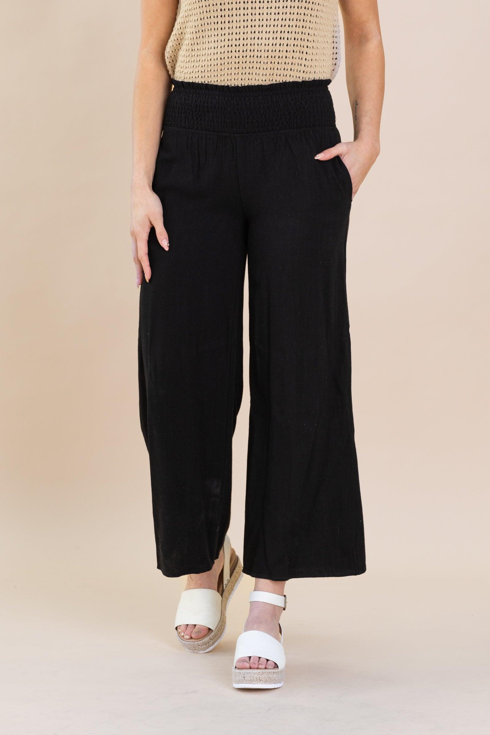 Product Details Color/Wash: Black/ Brown Rise: High Rise Style: Wide Leg Brand: La Miel Material and Care 70% Viscose 30% Linen Hand Wash Cold Line Dry Size and Fit Small: Waist 24" Rise: 11.5" Inseam: 28" Medium: Waist 26" Rise: 12" Inseam: 28" Large: Waist 28" Rise: 12" Inseam: 28" Model is 5'8 and is wearing a size small