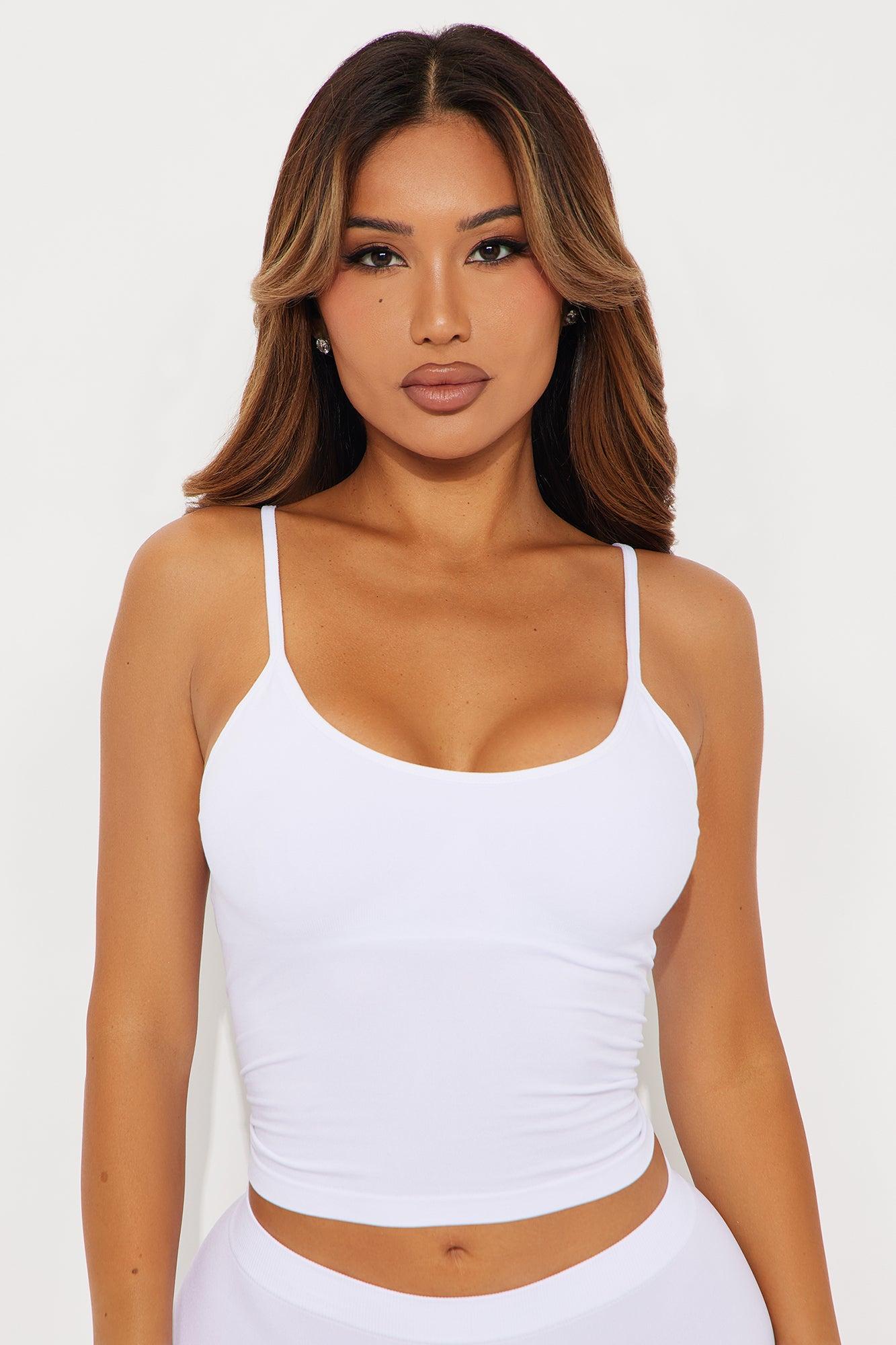 Available In Black, Chocolate, Taupe And White. Seamless Cami Spaghetti Strap Update To Tank W/Shelf Bra Stretch Final Sale 90% Nylon 10% Spandex Imported
