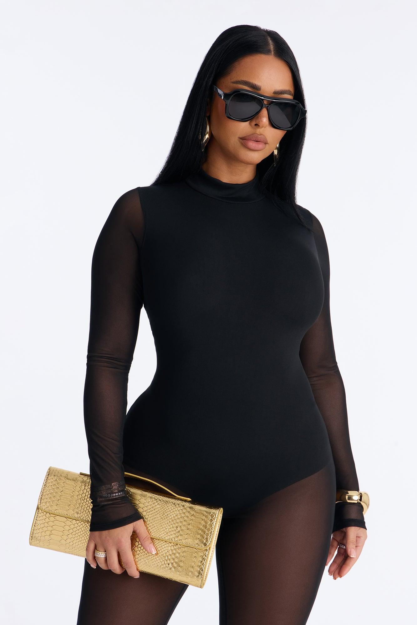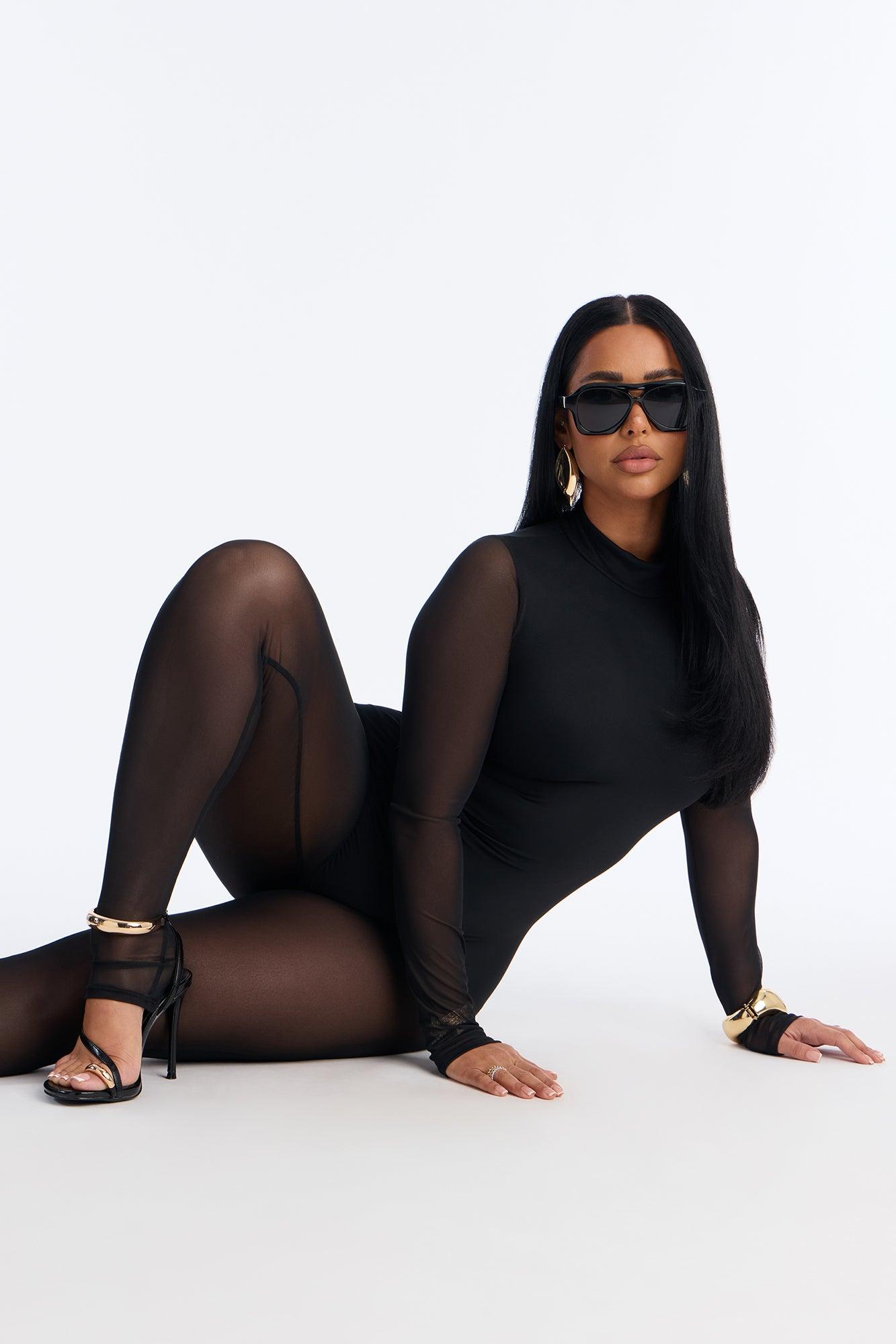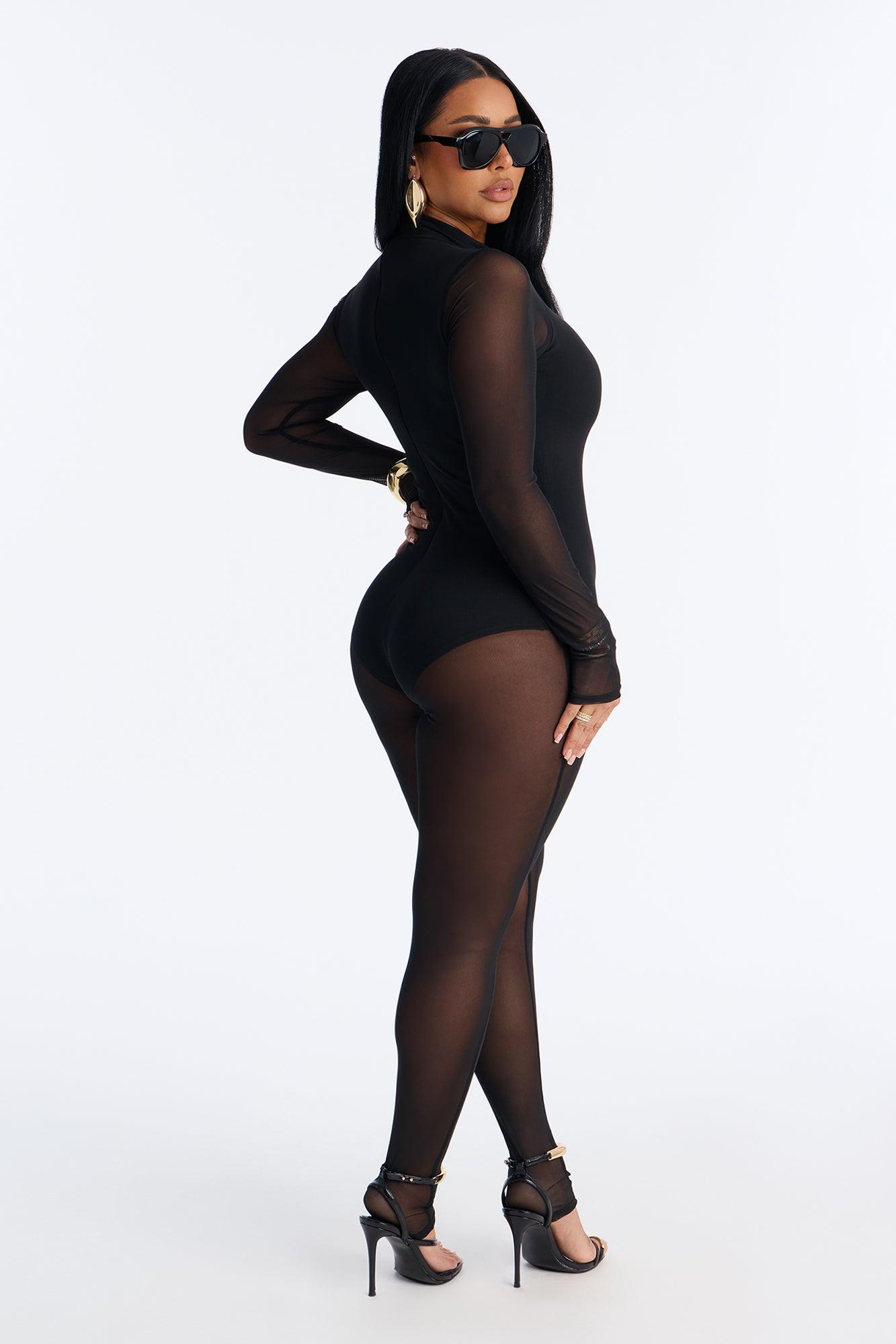Available In Black. Jumpsuit Stretch Long Sleeve Mock Neck Skinny Leg Invisible Back Zipper Bodysuit Lining 30" Inseam Self : 95% Polyester 5% Spandex Contrast : 95% Polyester 5% Spandex Imported California Proposition 65WARNING: Cancer and Reproductive Harm - www.P65Warnings.ca.gov.