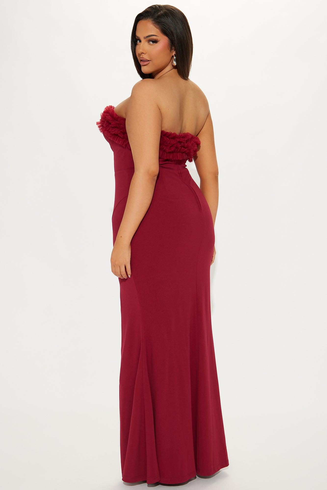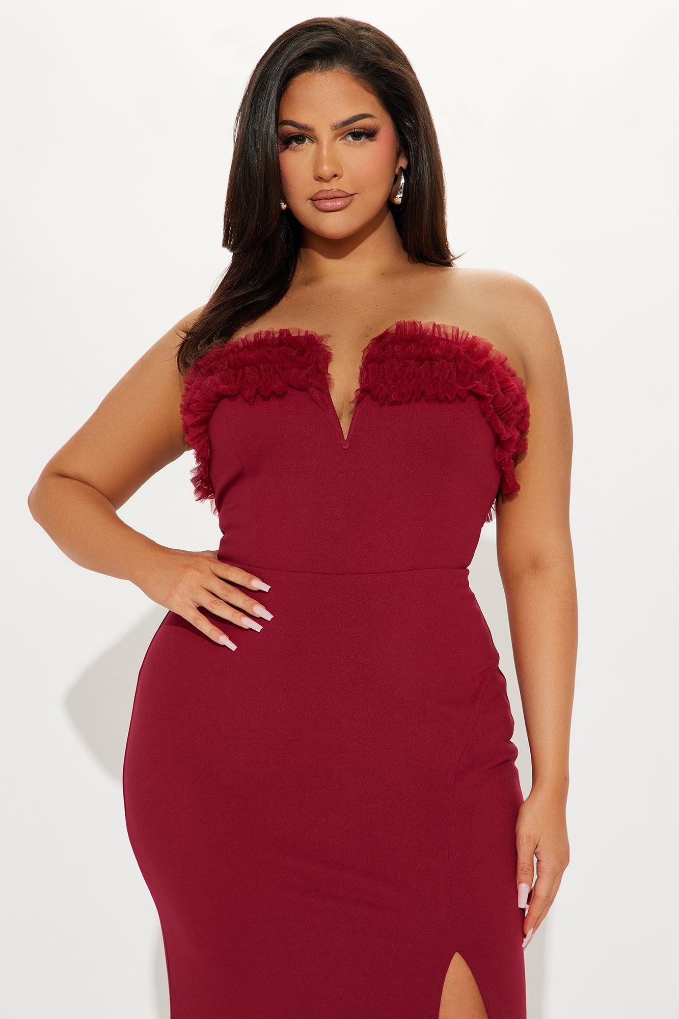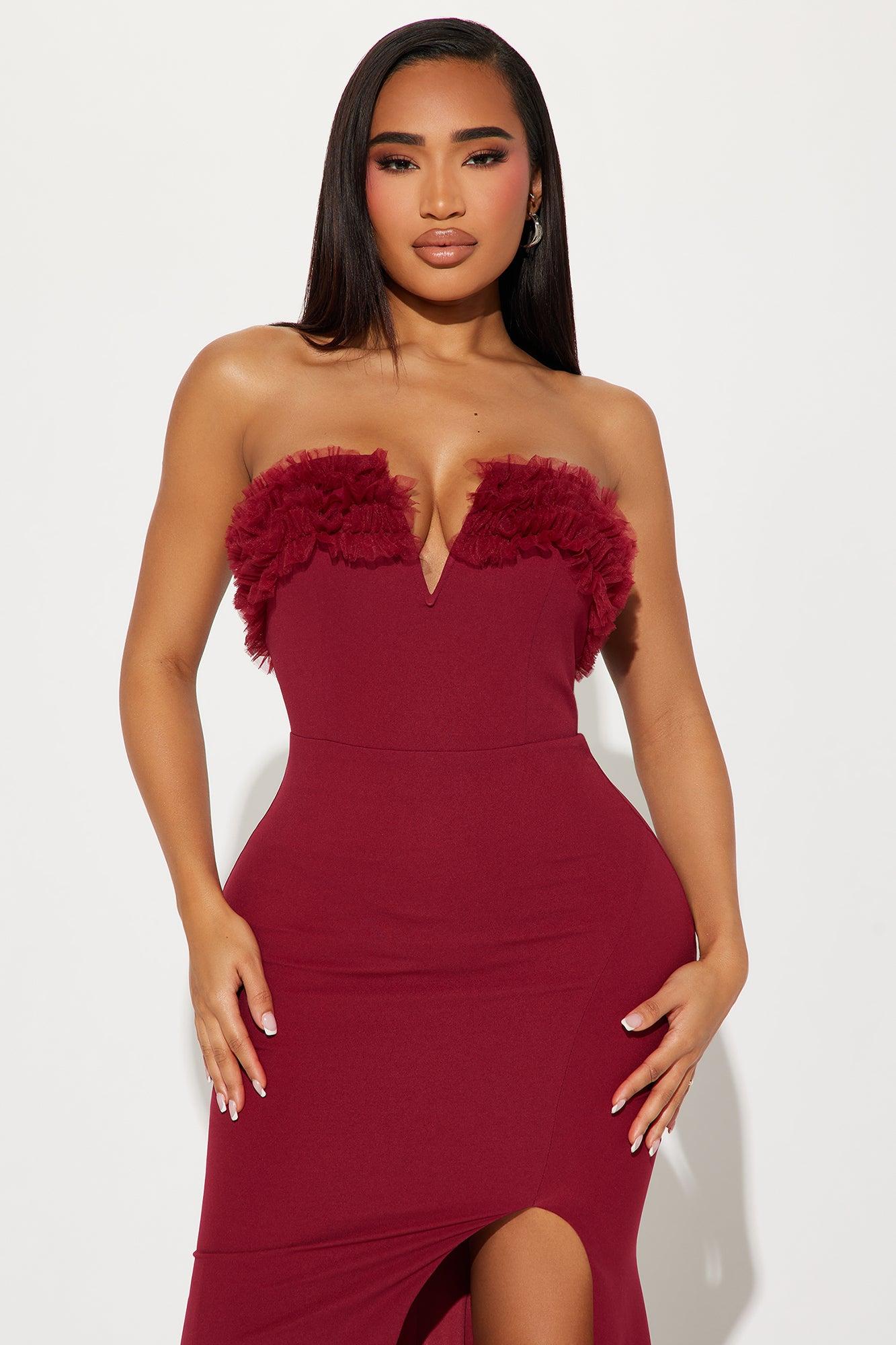 Available In Wine. Crepe Maxi Dress Strapless V-Neckline V-Wire High Slit Ruffle Trim Invisible Back Zipper Stretch Self: 95% Polyester 5% Spandex Lining: 100% Polyester Imported California Proposition 65 WARNING: Cancer and Reproductive Harm - www.P65Warnings.ca.gov.