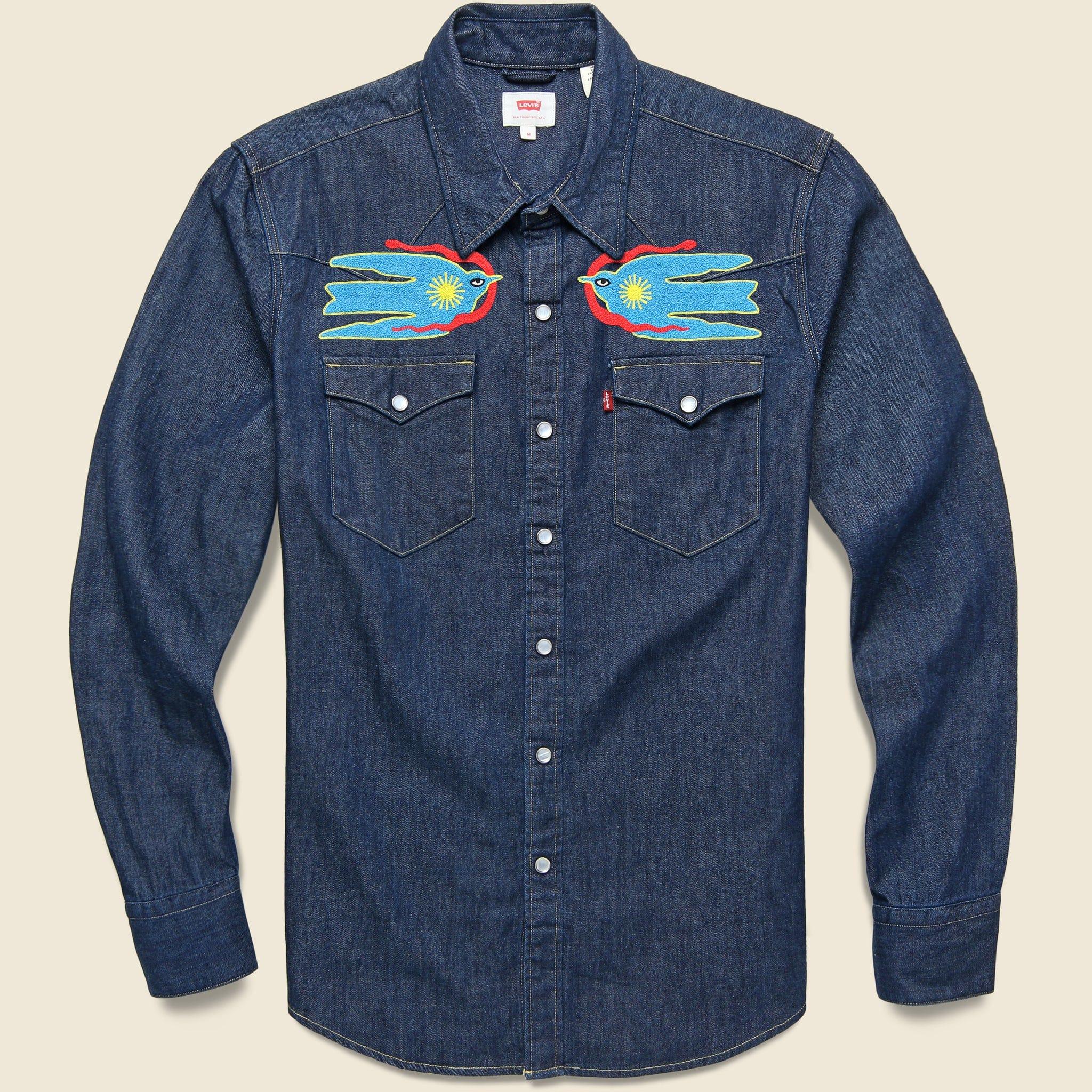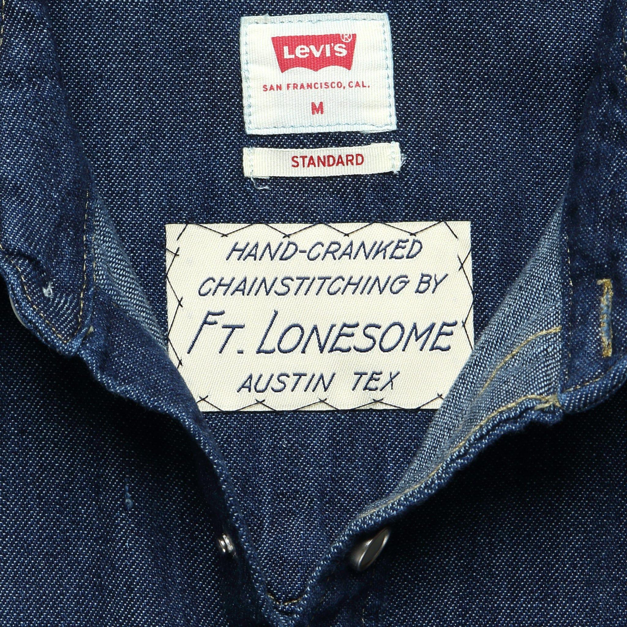 This Levi’s Western shirt has been exclusively embroidered by the chainstitch champs Fort Lonesome and is the latest addition to the Fort Lonesome for STAG Chainstitch Collection. The Snake Birds at both shoulders aren’t just a couple of pre-made, iron-on patches, but instead have been directly embroidered using a 100-year-old machine right here in Austin, Texas. It’s cut with a slim, classic western fit through the body and sleeve and is only available at STAG. Direct chainstitch embroidery by Fort Lonesome Made exclusively for STAG Stitched on Levi’s Barstow Western shirt Two chest pockets with pearl snaps Pearl snap placket and cuffs Slim fit through the body and sleeve We recommend taking your normal size or taking one size up for a more relaxed fit Handmade in Austin, TX The following measurements are for size Medium: Chest: 40” | Shoulders: 16” | Sleeve: 32” | Length: 29”
