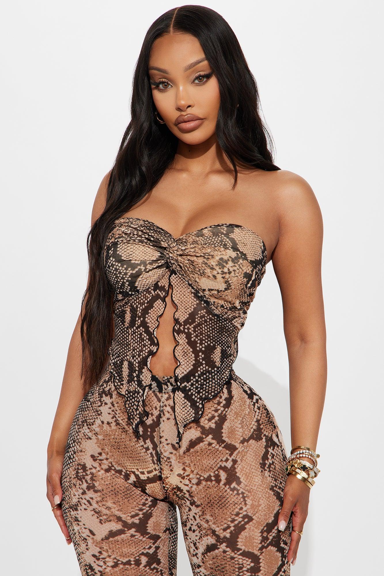 Available In Taupe/combo. 2 Piece Ensemble Mesh Strapless Top and Flare Pant Set Stretch 35" Inseam Elastic Waistband Disclaimer: Due To the Nature Of Sublimation print process, Each Garment is Unique Self: 95% Polyester 5% Spandex Lining: 100% Polyester Imported