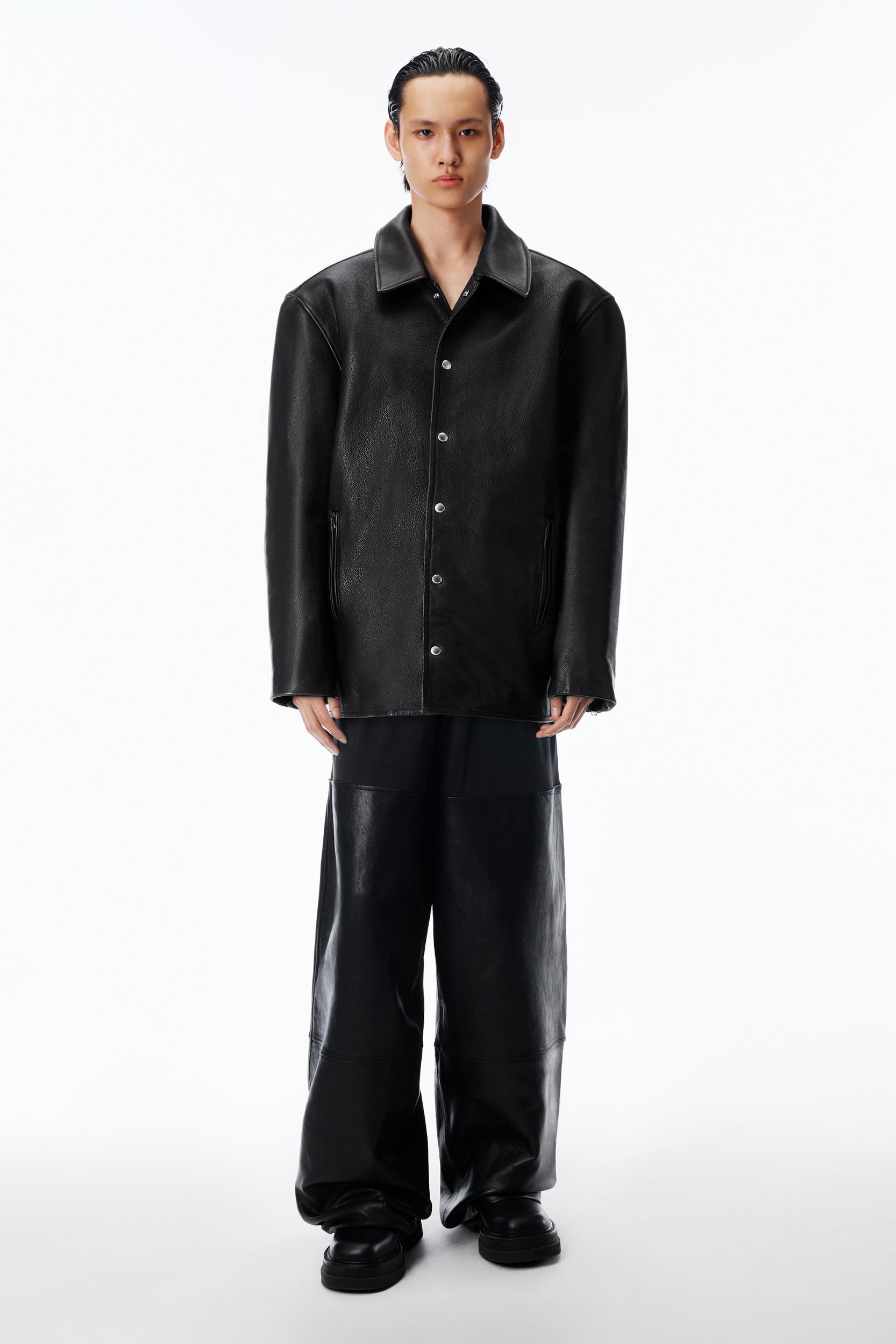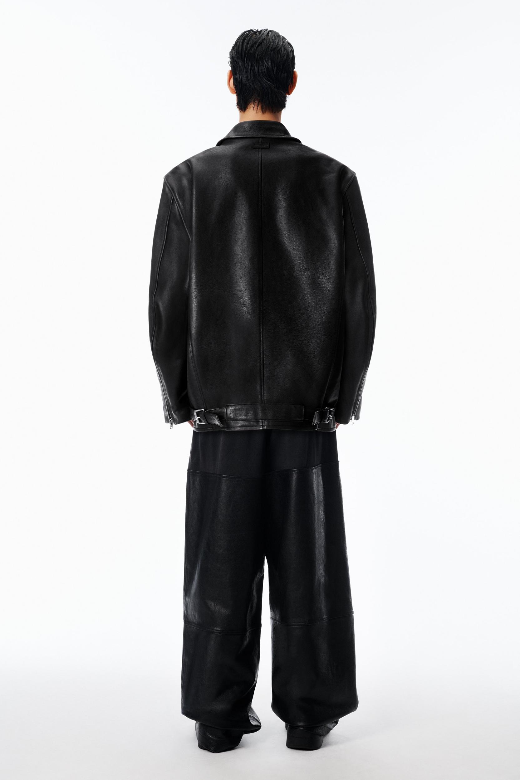 Black rustic cow leather jacket cut in an oversized moto silhouette. Designed with a spread collar, snap front closure, zip gusseted sleeves, and adjustable double-buckle back hem, finished with zip welt pockets and a self logo patch at the back neck.