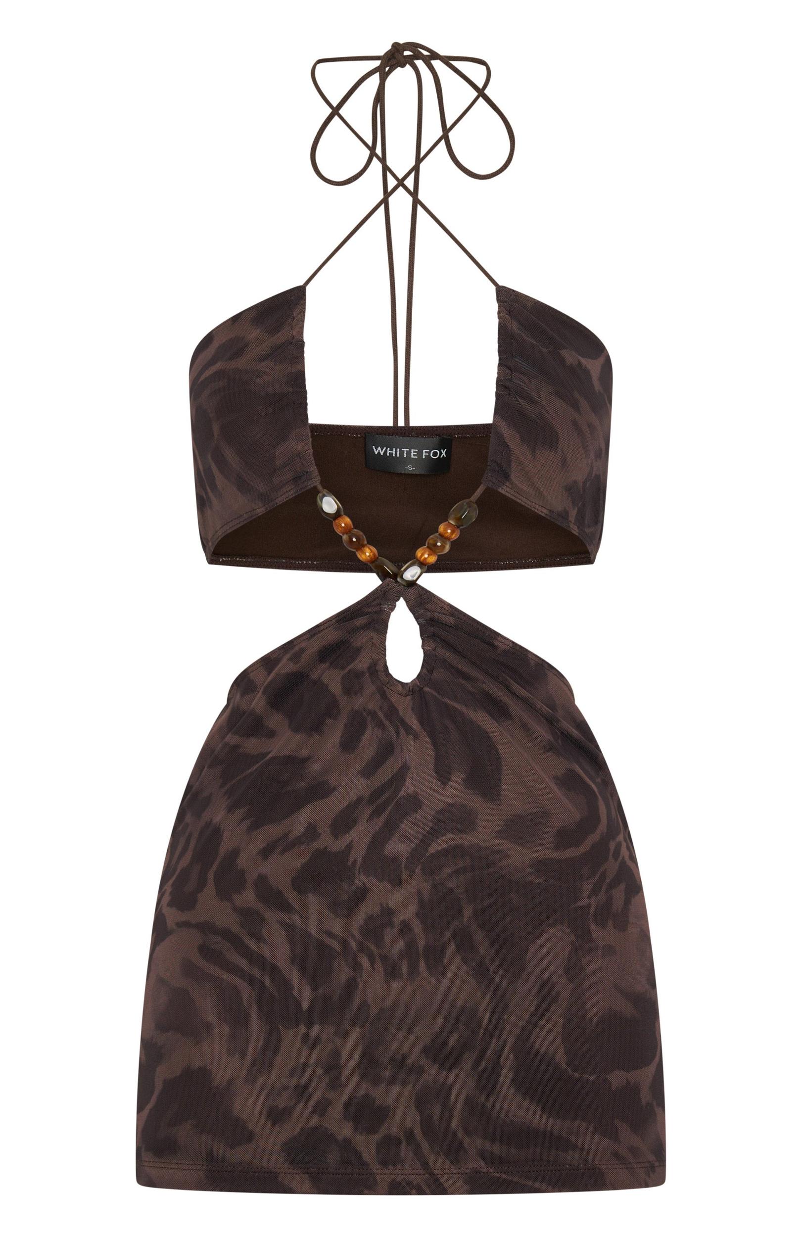 It's all about the details with the Snap Out Of It Printed Mesh Mini Dress in Espresso! Features criss cross self tie halter neck straps, cut out on waist with bead detailing and backless. Complete the look with kitten heels, gold accessories and a shoulder bag for the perfect summer nights dinner fit! 95% Polyester, 5% Spandex Georgie is 172cm & wears an XS Ash is 166cm & wears an XS
