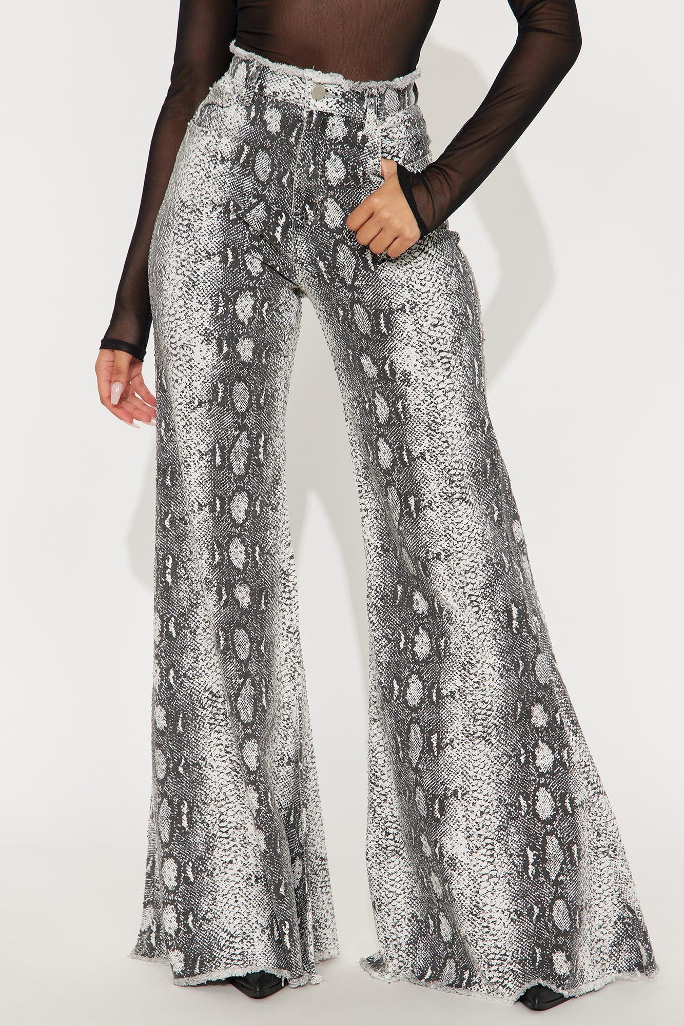 Available In White/combo. Bell Bottom Jean 5 Pocket Snake Print Embellished Fray Hem 11.5" Rise 35" Inseam Medium Stretch Disclaimer: Rhinestone Placement Will Vary. Due To The Distressing Process, Each Garment Is Unique. 75% Cotton 23% Polyester 2% Spandex Imported