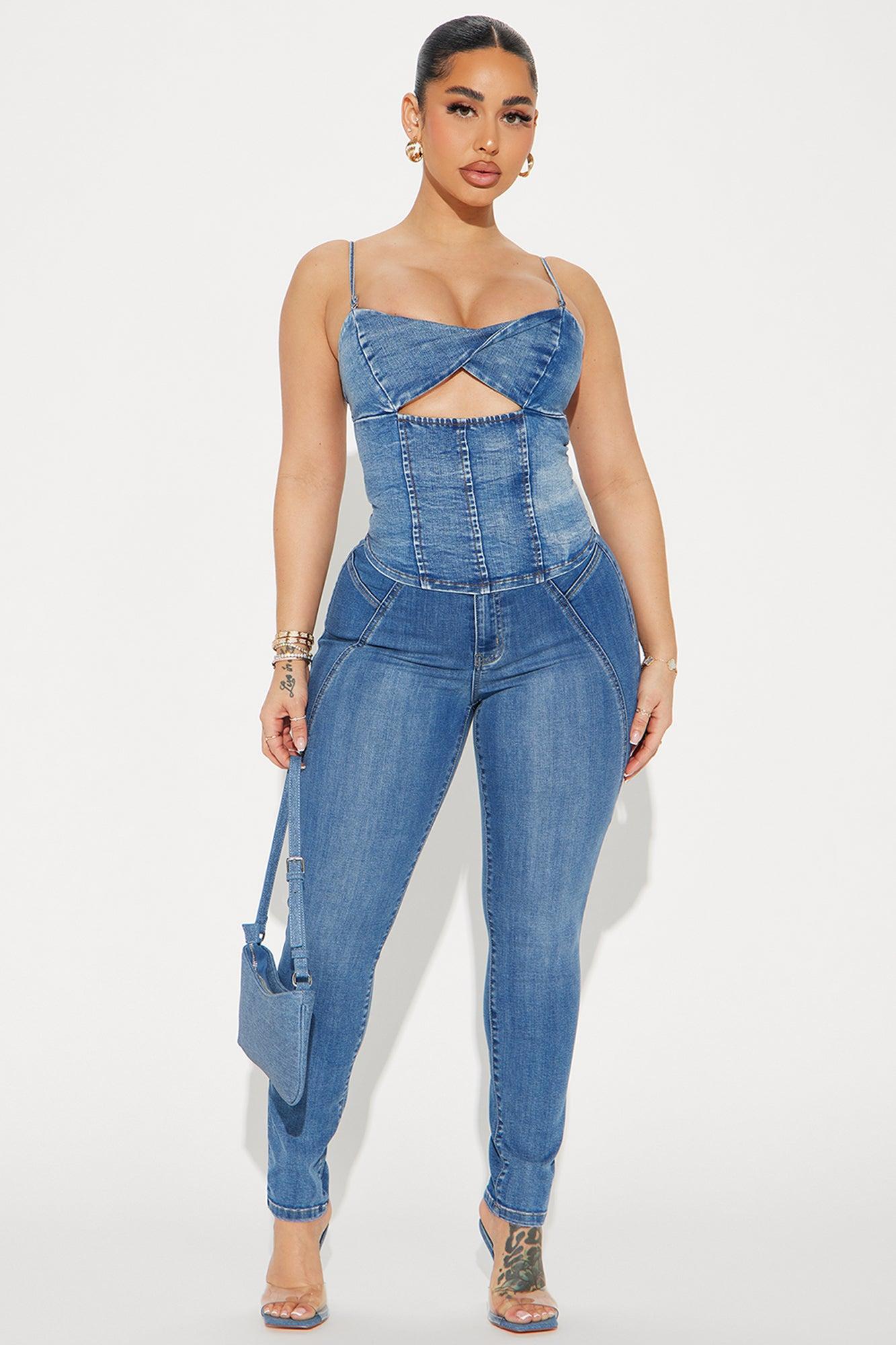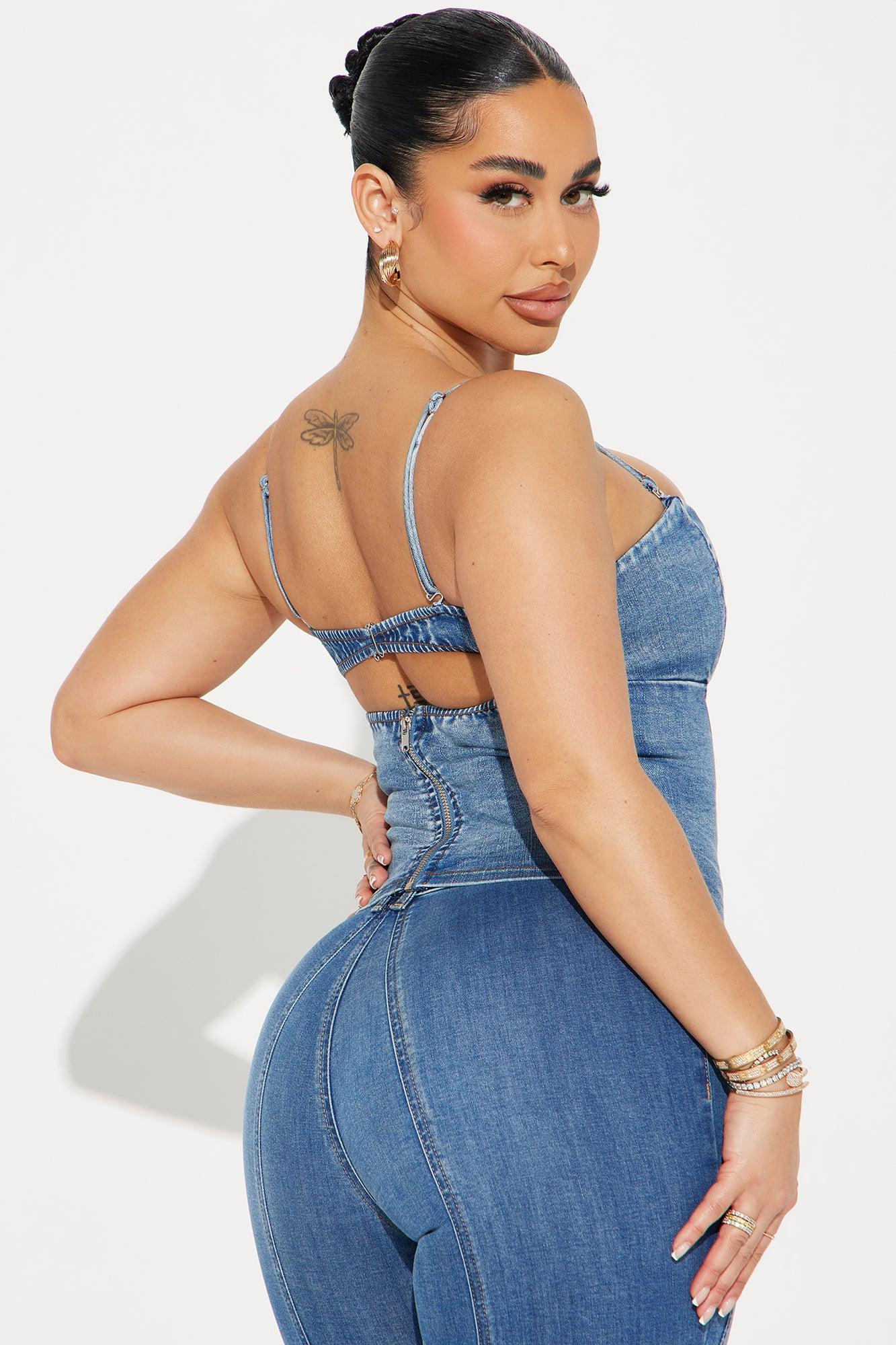 Available In Medium Wash. Denim Cami Top Sleeveless Adjustable Straps Boning Detail Sweetheart Knot/Twist Front Cut Out Detail Back Zipper Closure Stretch Self: 80% Cotton 17% Rayon 3% Spandex Imported