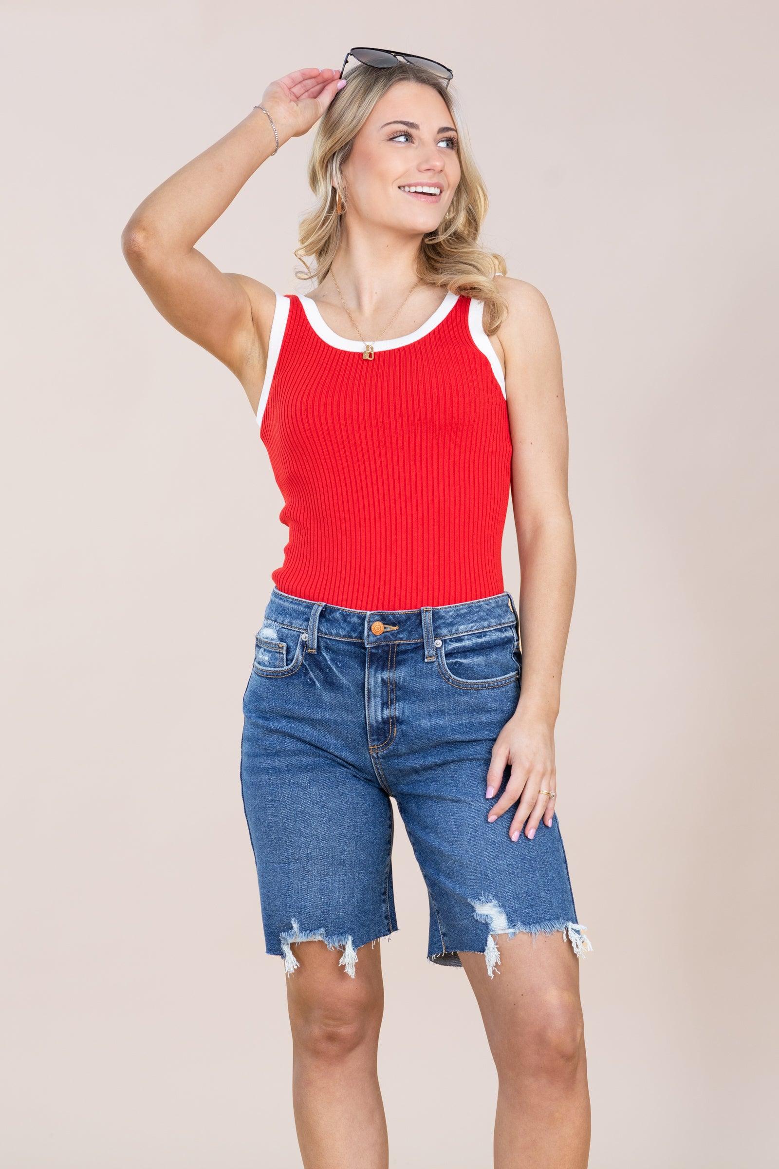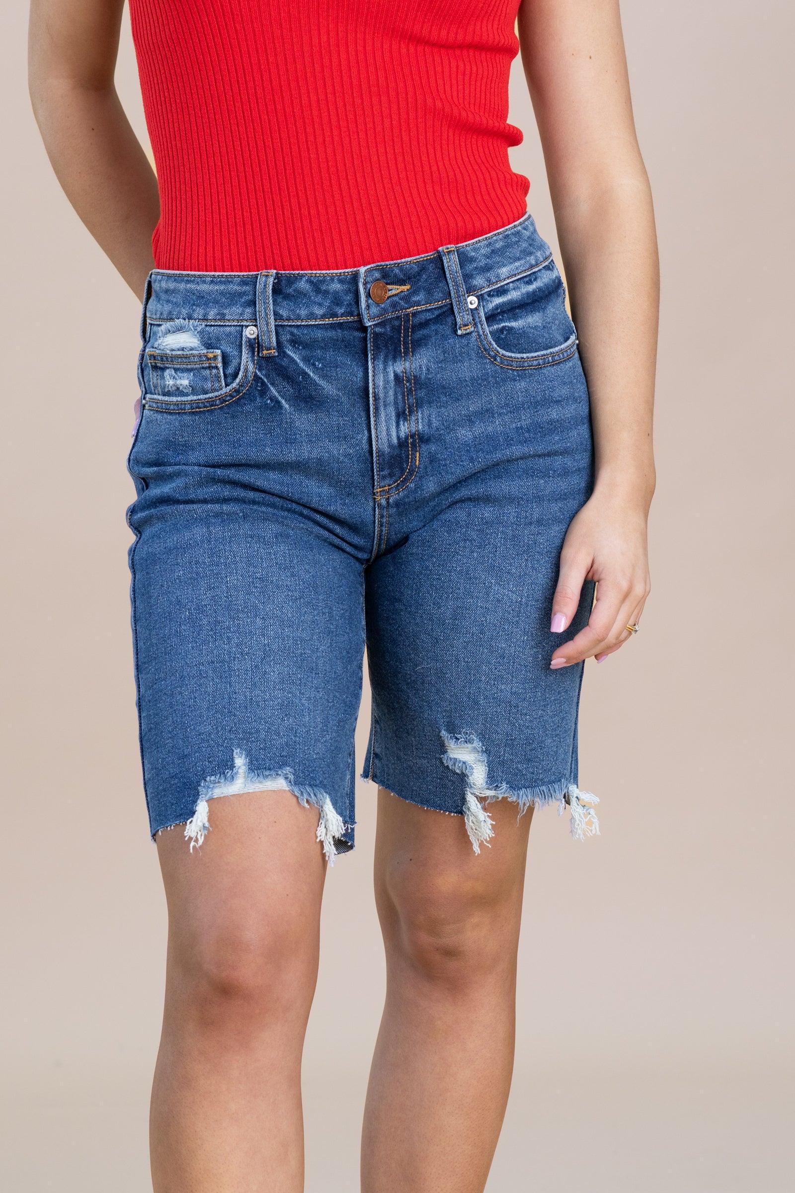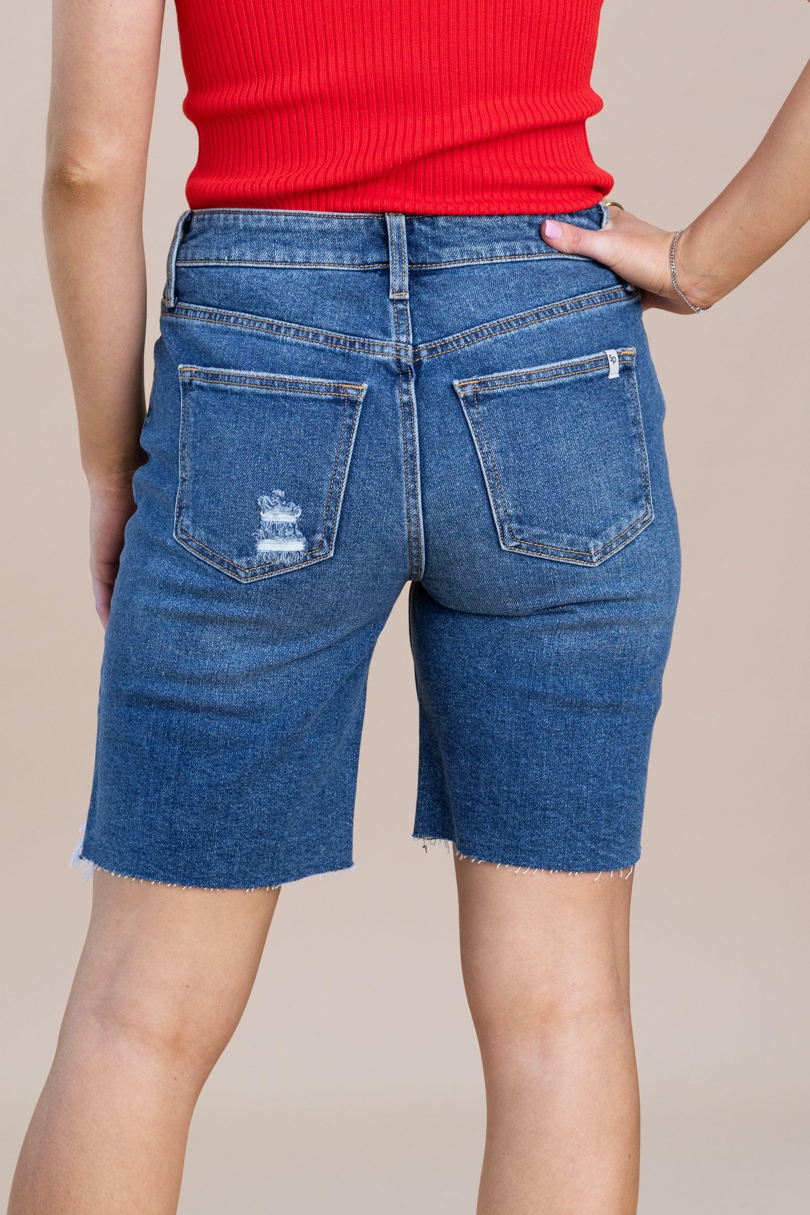 Product Details Color/Wash: Medium Wash Rise: High Rise Style: Bermuda Brand: Sneak Peek Material and Care 97% Cotton 2% Elasterell-Polyester 1% Spandex Machine Wash Cold Tumble Dry Size and Fit Small: Waist 30" Rise 10.5" Inseam 8.5" Medium: Waist 32" Rise 10.5" Inseam 8.5" Large: Waist 34" Rise 11" Inseam 8.5" Model is 5'7 and is wearing a size small Video model is 5’8 and wearing size small