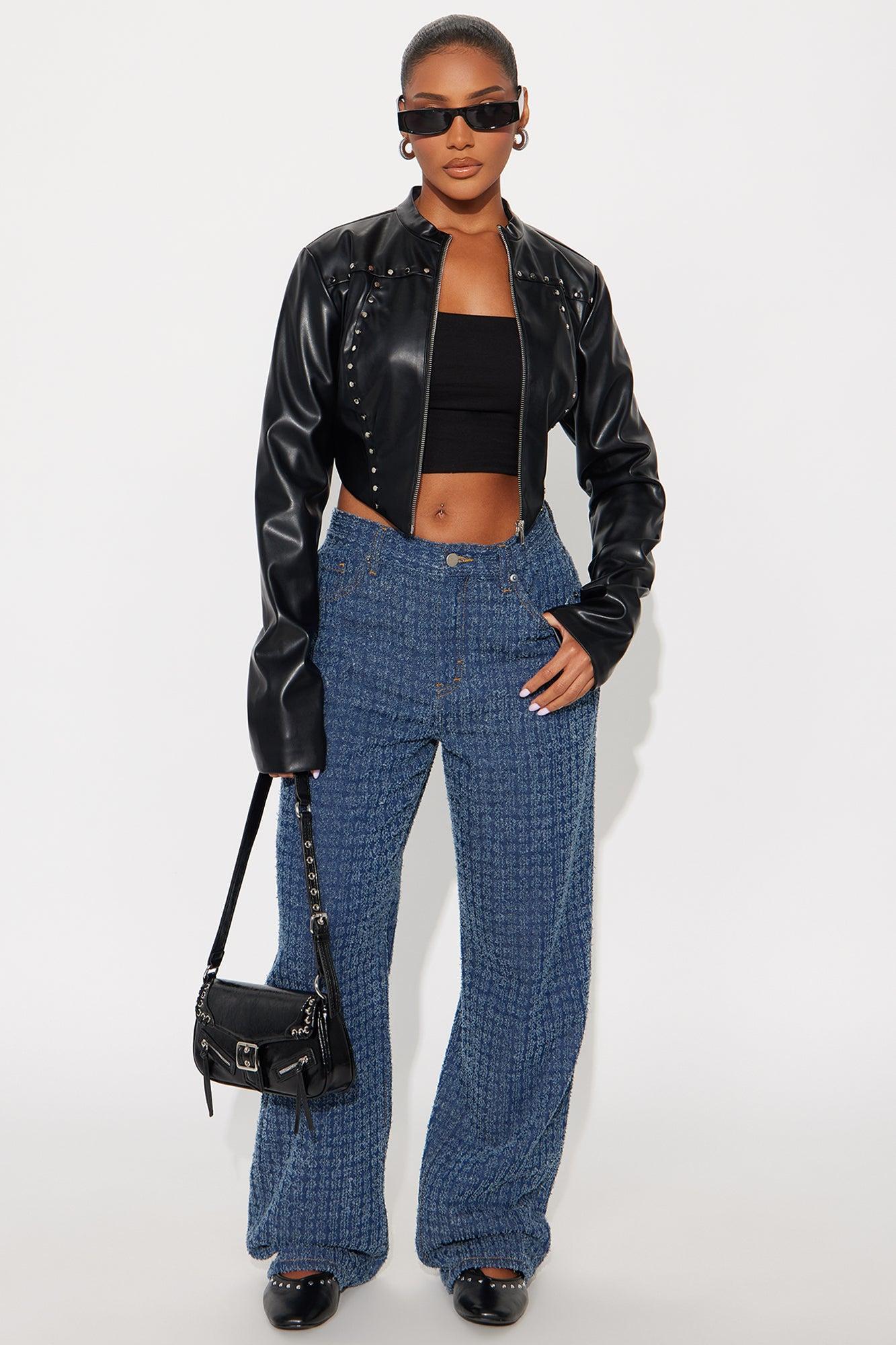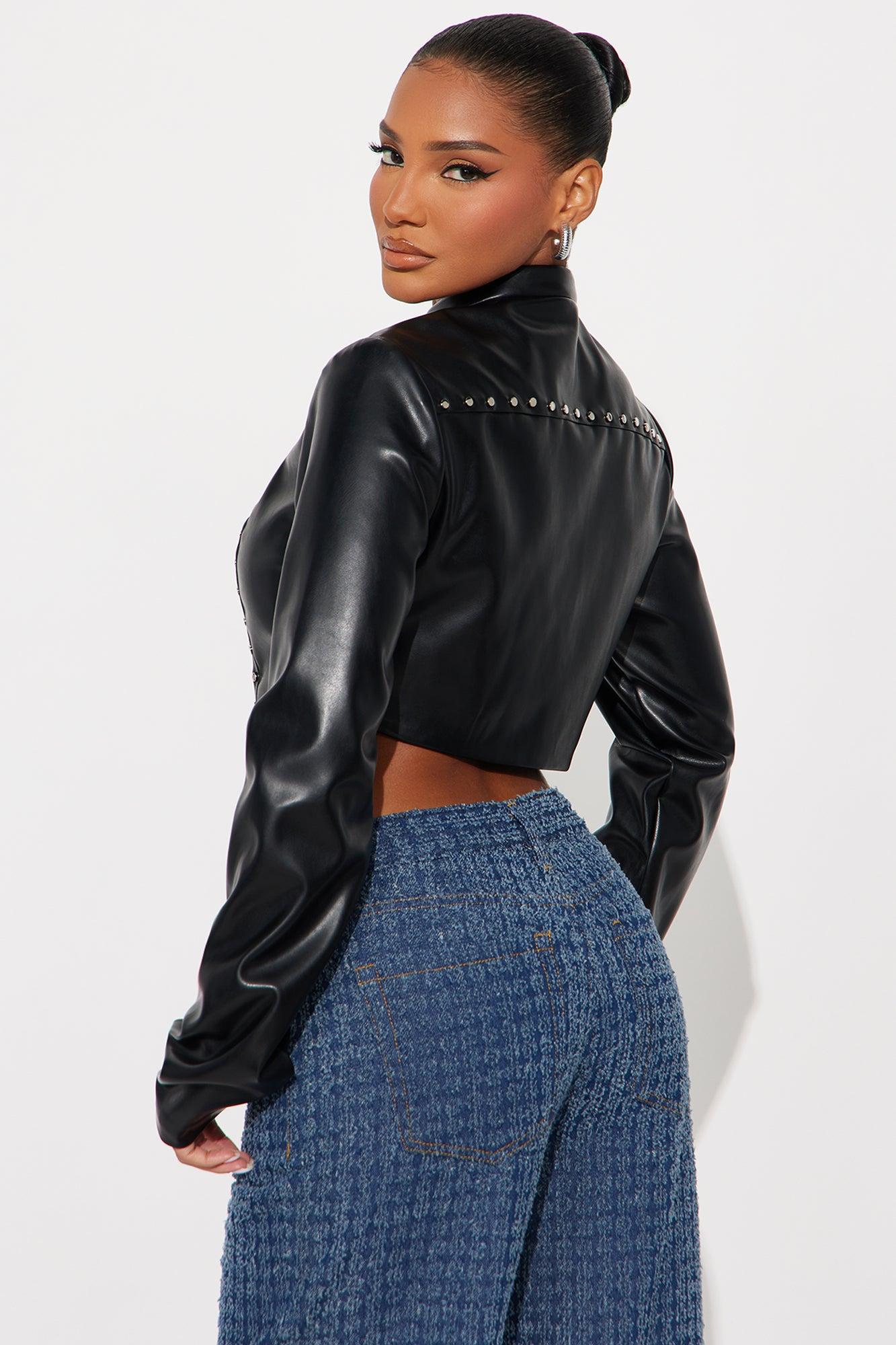 Available In Black. Blazer Cropped Front Zip Studded Detail Fully Lined Non Stretch Self: 50% PU ( Polyurethane) 50% Polyester Lining: 100% Polyester Imported California Proposition 65WARNING: Cancer and Reproductive Harm - www.P65Warnings.ca.gov.