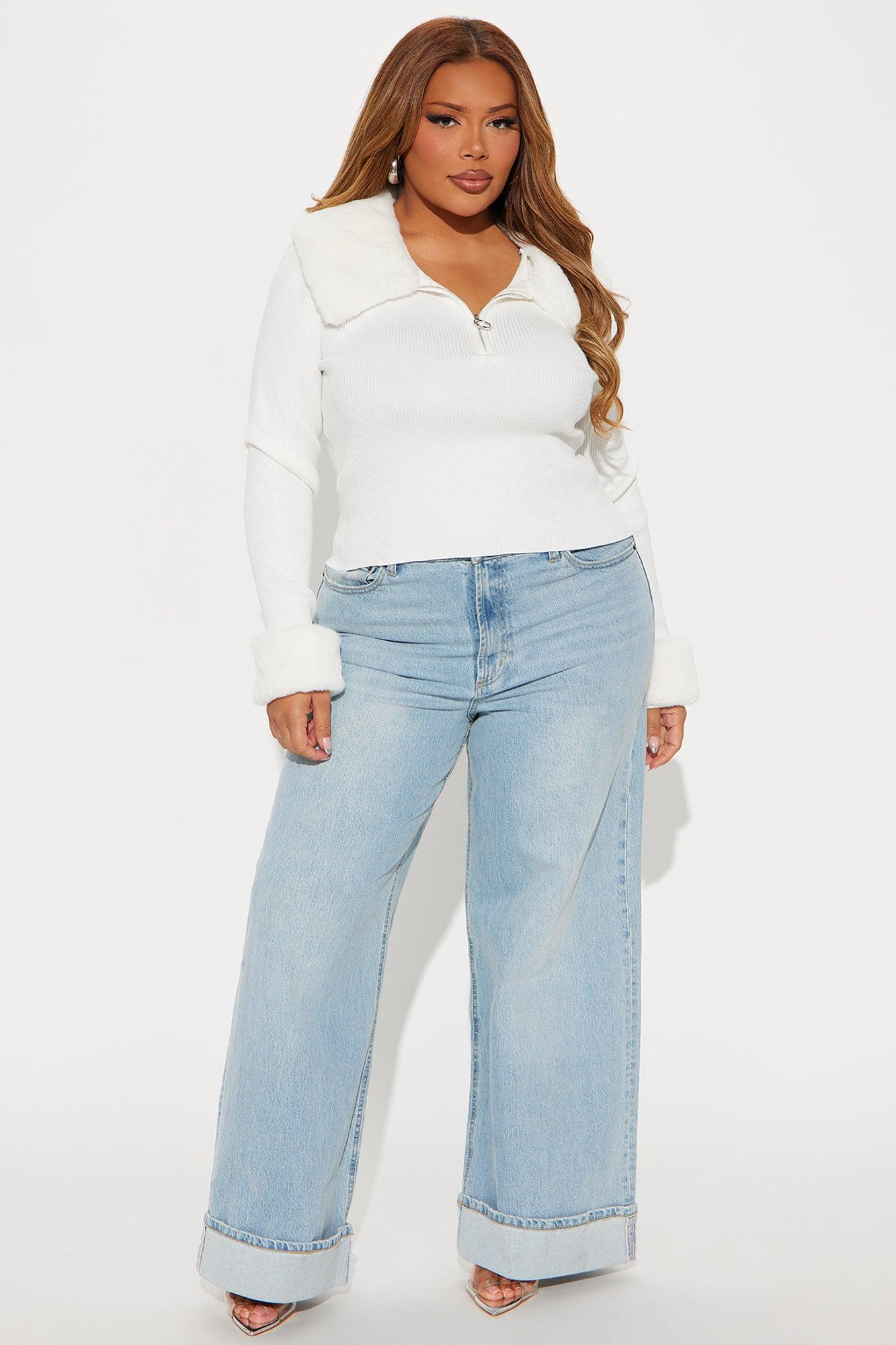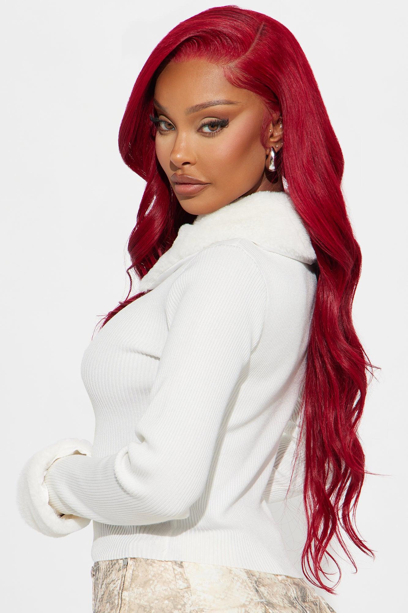 Available In Ivory And Black. Pullover Sweater Long Sleeve Collar Detachable Faux Fur Trim Quarter Zipper Front Ribbed Body: 68% Rayon 32% Polyester Collar and Sleeve Cuffs: 100% Polyester Collar Facing: 100% Polyester Collar Filling: 100% Polyester Imported California Proposition 65 WARNING: Cancer and Reproductive Harm - www.P65Warnings.ca.gov.