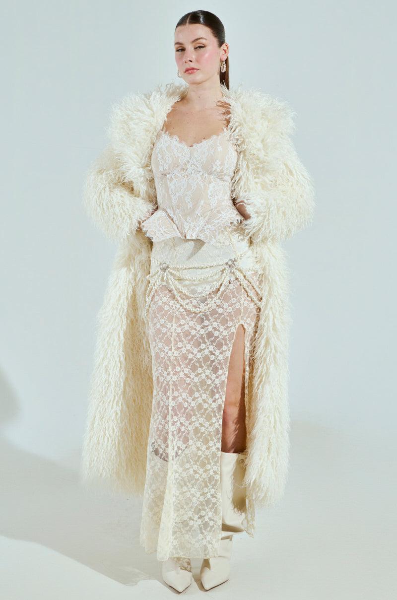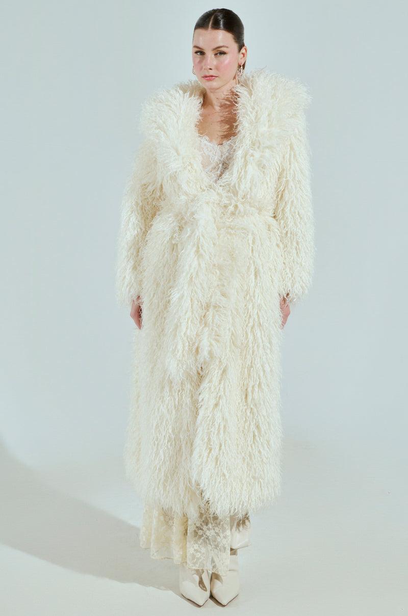 Mirror, mirror on the wall, who’s the fairest of them all? You, in The AKIRA Label Snow White Trench. This gorg coat is crafted from a shagalicious faux fur base and features a wide fold over collar, long sleeves, a coordinating self-tie waist belt, on-seam side pockets, and a tonal satin-lined interior. Complete with an open front, and a longline silhouette. Pair with a knit sweater, flared denim, and stiletto boots for a fairytale finish. - Self: 100% Polyester, Lining: 100% Polyester- Dry Clean Only- No Stretch- Imported (all measurements approximate from size S/M)- 50” Shoulder to Hem- 20” Shoulder to Shoulder- 24” Sleeves- Model is 5’9” and is wearing size S/M Product ID: 1027116