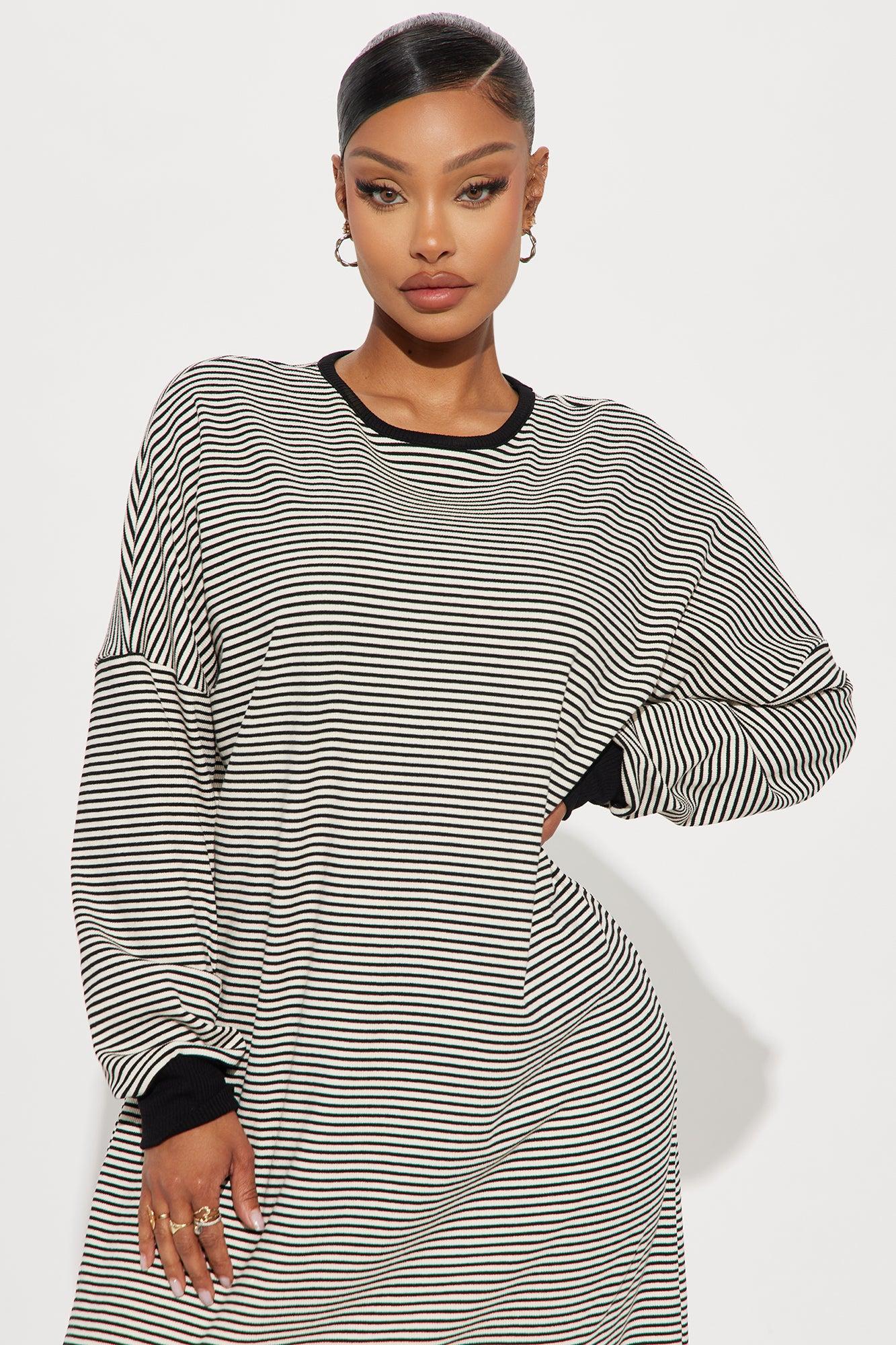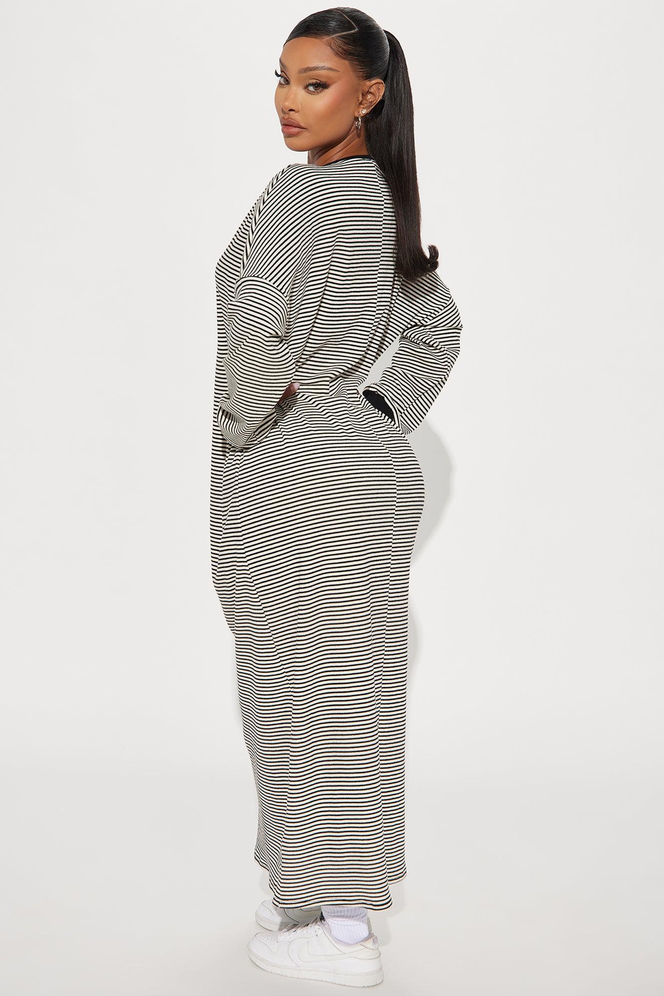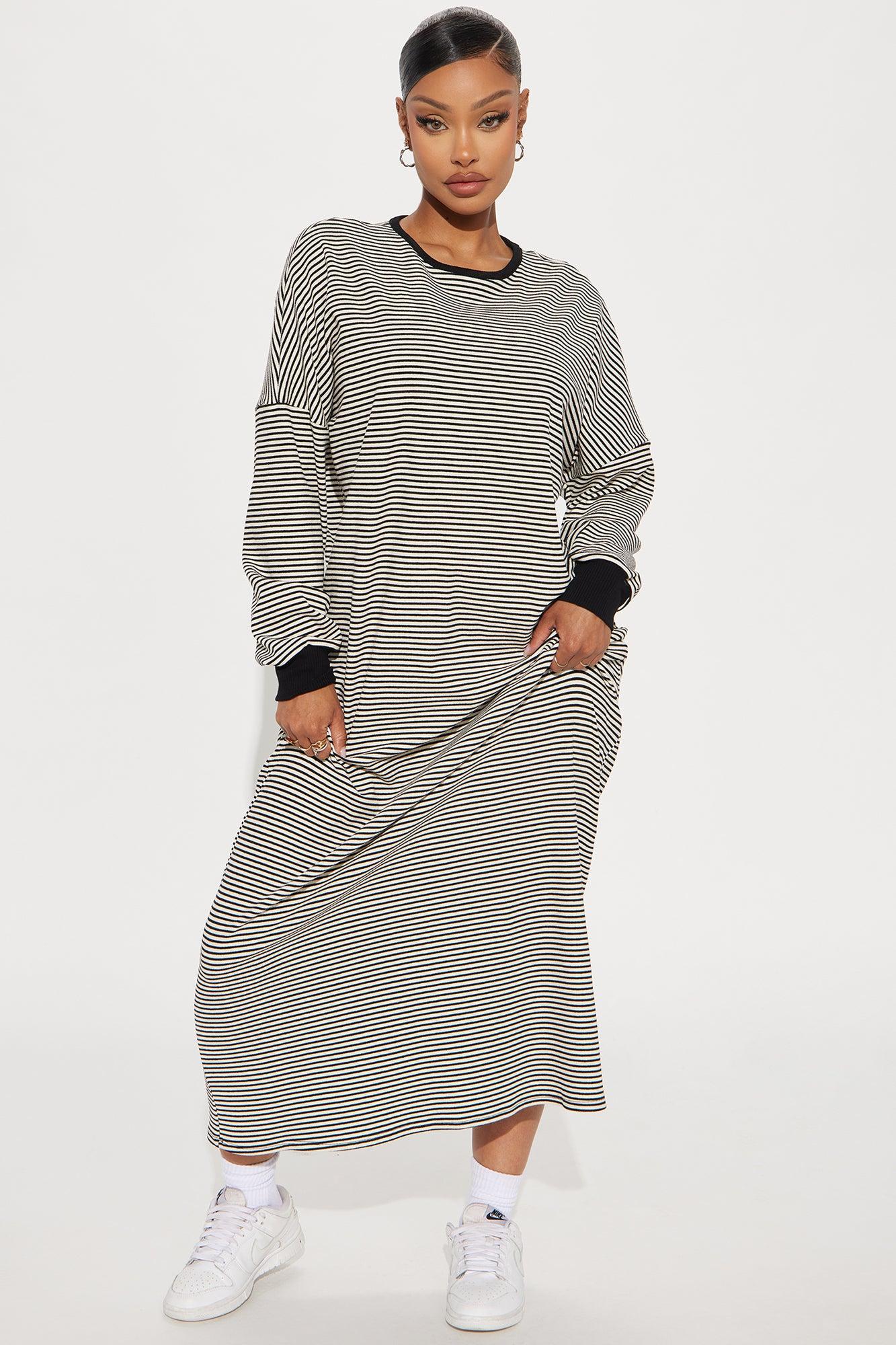 Available In Black/White. Ribbed Maxi Dress Oversized Crew Neck Long Sleeves Stretch Self: 55% Cotton 41% Polyester 4% Spandex Contrast: 91% Rayon 9% Spandex Imported California Proposition 65WARNING: Cancer and Reproductive Harm - www.P65Warnings.ca.gov.