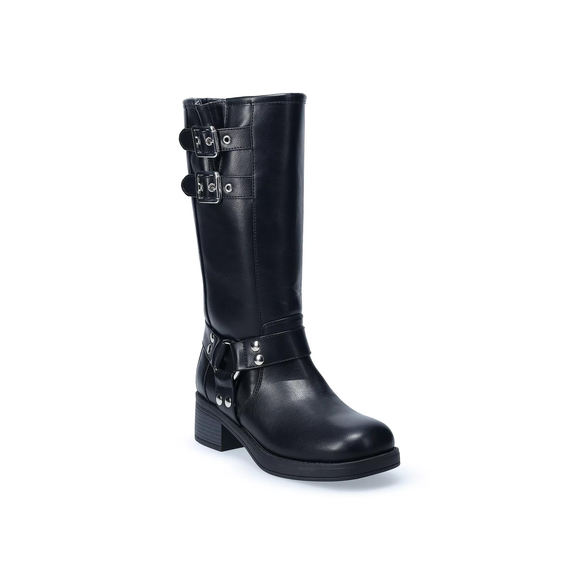 Step into style and confidence with these SO® knee-high boots that effortlessly blend chic and edgy vibes. With stunning buckle details and a comfortable heel, they’re perfect for turning heads at brunch or tackling that afternoon errand run—because who says you can’t have a little fun while being fabulously fashionable? Click this FOOTWEAR GUIDE to find the perfect fit and more! - https://www.kohls.com/feature/shoesizeguide.jsp. FEATURES: Knee-high design, Buckle accents for added style, Chunky heel for stability, Classic black color. FIT & SIZE: Shaft height: 11.8 in., Shaft circumference: 1.75 in. MATERIAL & CARE: PU upper, TPR outsole, Textile lining, Foam footbed, Spot clean. DETAILS: Zipper closure, Slip-resistant outsole, Round toe, Heel height: 1.42", Imported. Gender: female. Age Group: adult. Material: OTHER MATERIAL.