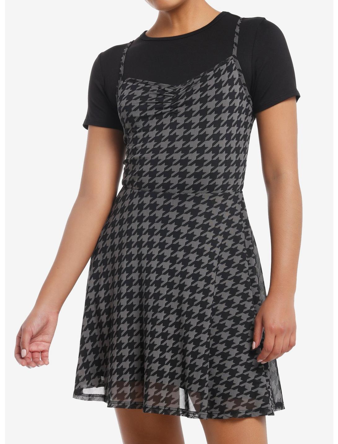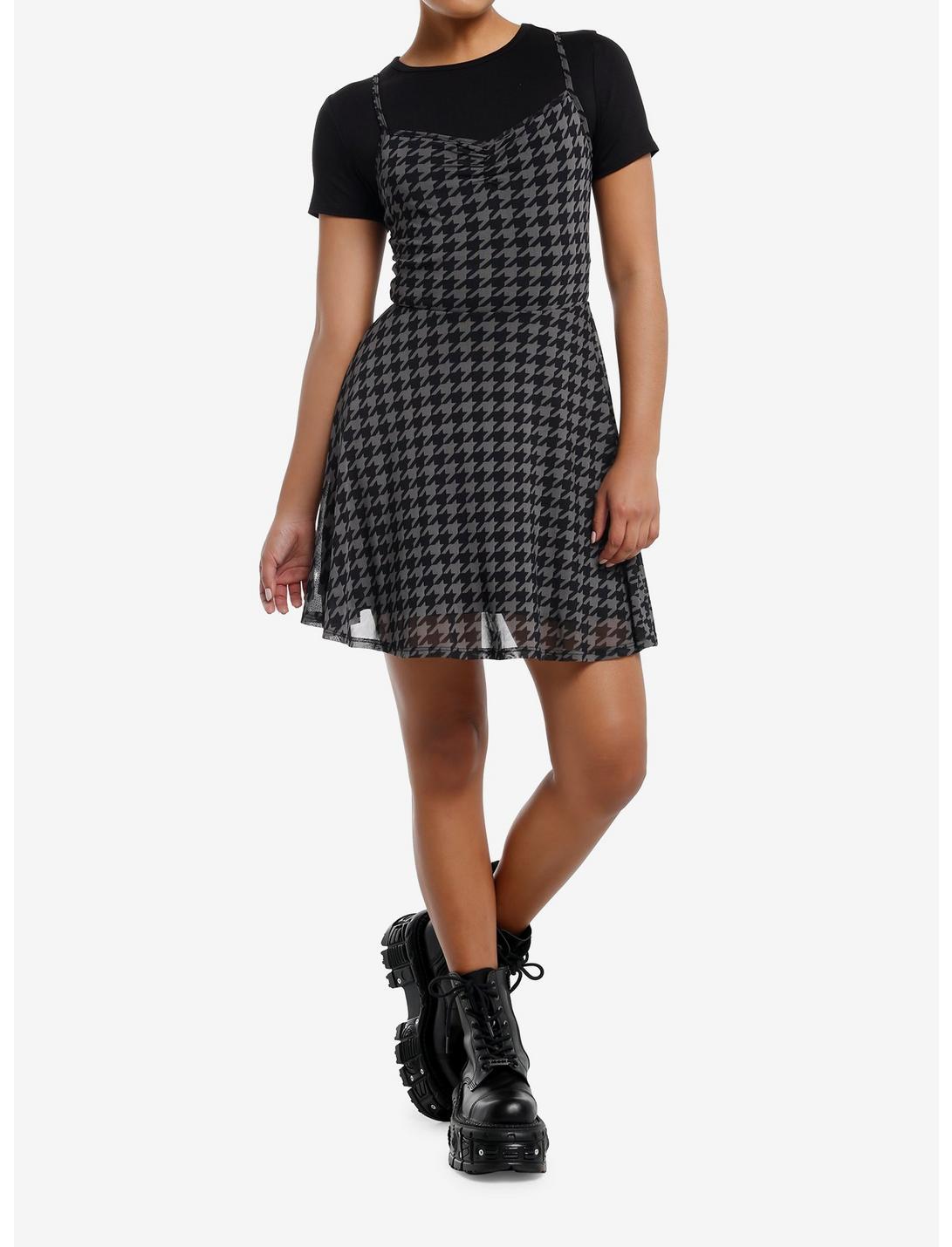 Enter fall with this striking piece! This twofer features a mesh slip with a black and grey houndstooth design, layered atop a black short-sleeve. Comes with adjustable straps.95% polyester; 5% spandexWash cold; dry lowStretchy materialLength: 35''ImportedListed in junior sizesModel is 5'9''Model wears size Small