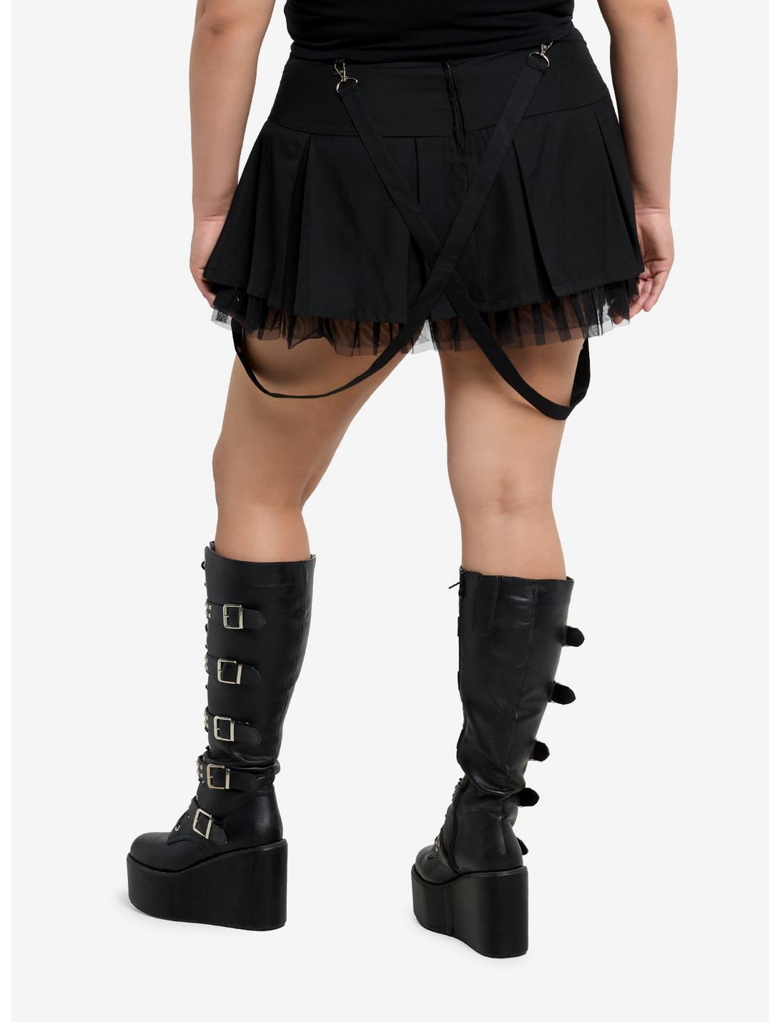 Look flirty and like a baddie in this black, pleated skirt! It features straps on the waistband with pyramid stud detailing, plus removable suspender straps with more studs. Complete with tulle trimming and a back zipper closure.Please note: Style is fitted with no stretch; size up for a looser fit.65% polyester; 35% rayonWash cold; dry lowNon-stretch materialLength: 17''ImportedModel is 5'10''Model wears size 1