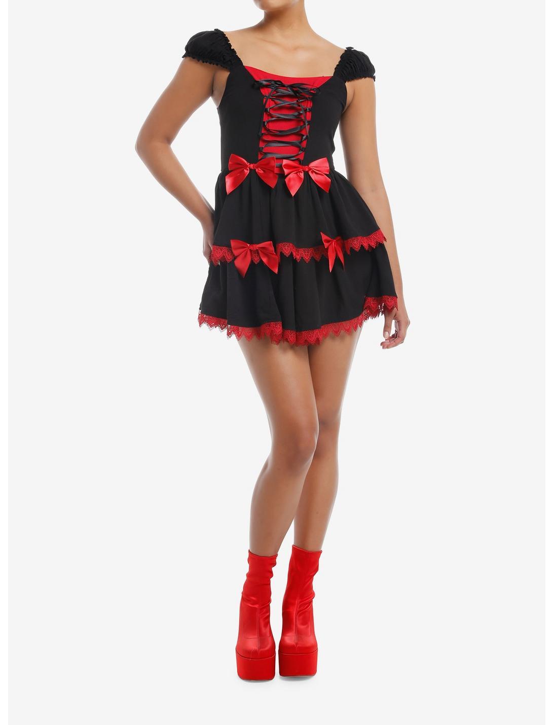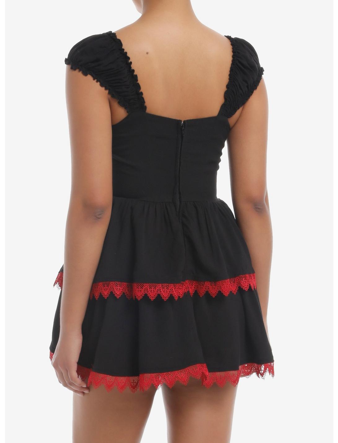 Now this is the kind of holiday dress we dream about! It is black and red, with a tiered skirt decorated with red lace. There's lace-up detail at the front against a red contrast panel, and red bows at the waist. Gathered sleeves and back zipper. This dress is lined.100% rayonWash cold; dry lowImportedListed in junior sizesModel is 5'10"Model wears size Small