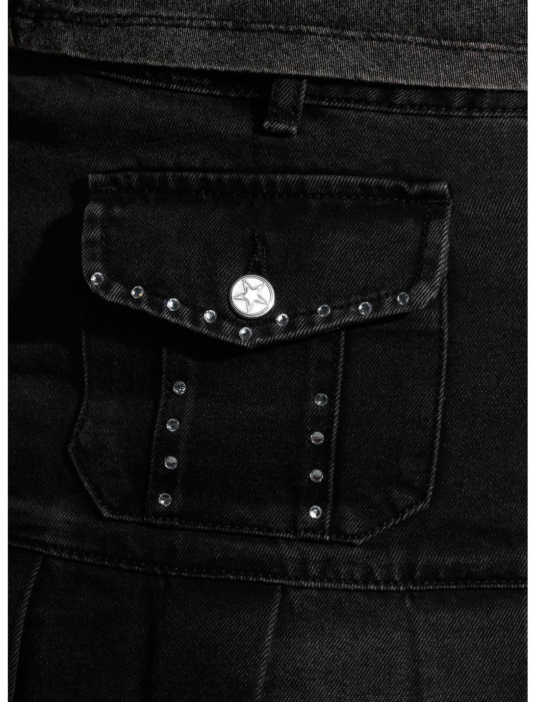This black denim skirt has just the right amount of edgy detail. There are rounded studs on the front hip pockets, and the skirt comes with three (removable) charms: a gothic cross, a regular cross and a starburst. The button closures have stars on them, and there are ruffles with frayed edges.100% cottonWash cold; dry lowLength: 17"ImportedModel is 5'10"Model wears size 1