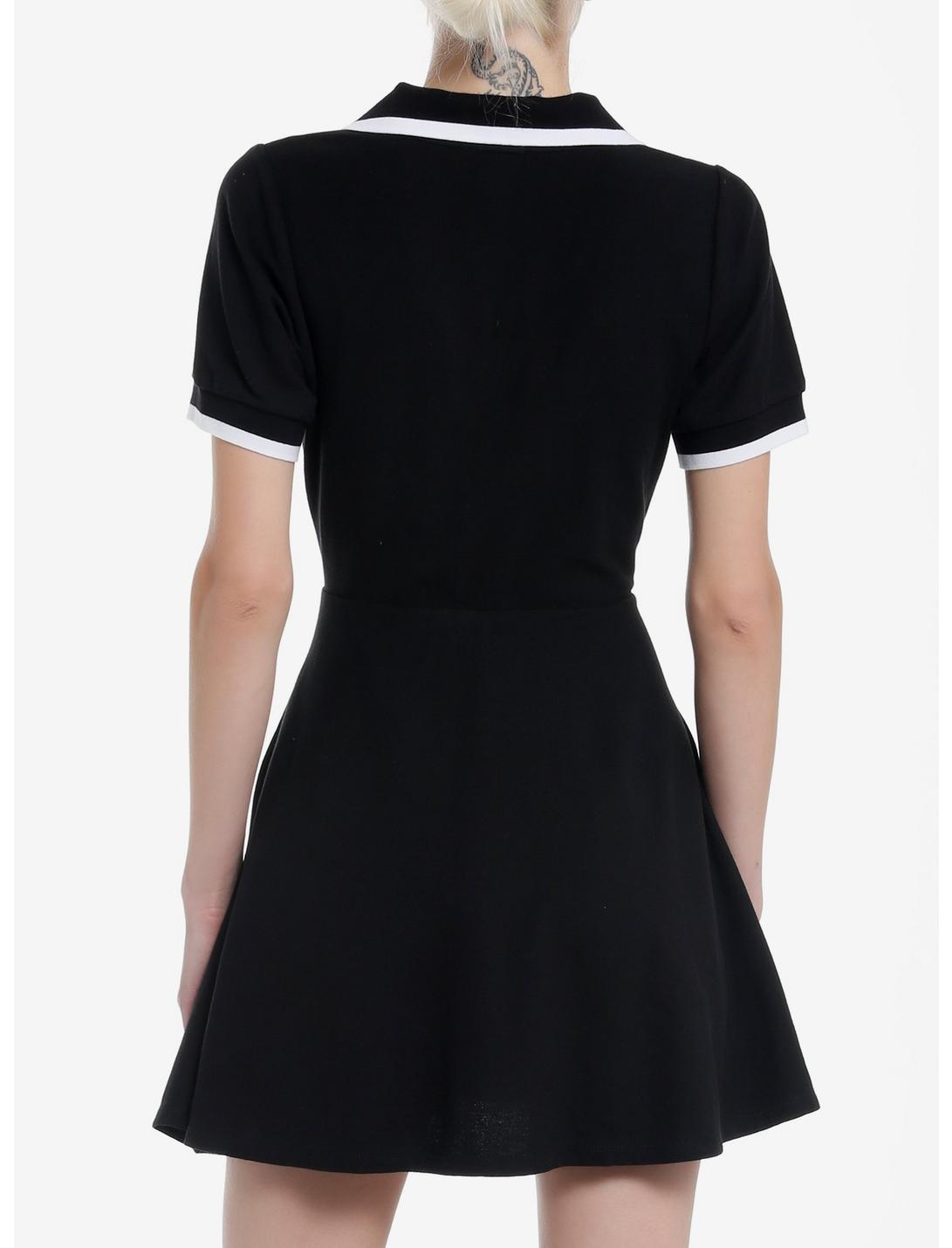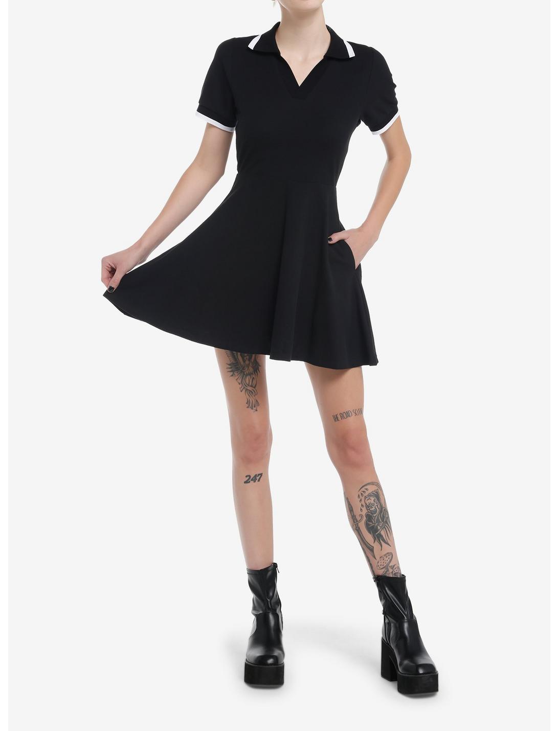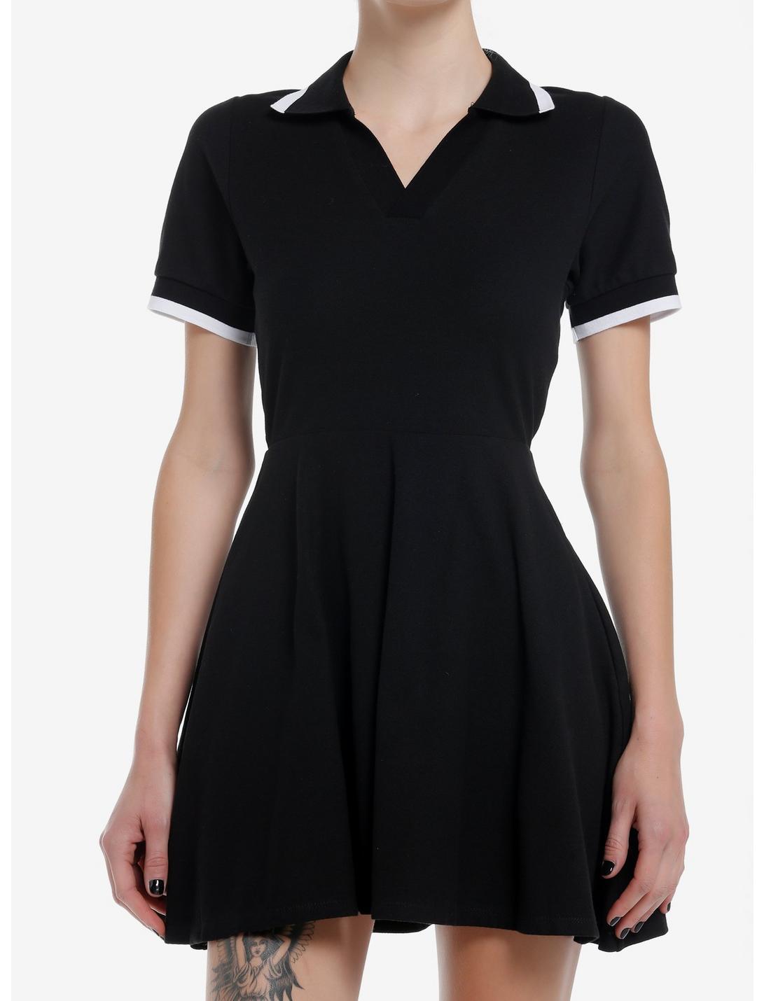 Go for a casual sporty look with this polo dress! It features contrast white trim on the collar and on the sleeves. Comes with a flared skirt and hip pockets.95% cotton; 5% spandexWash cold; dry lowLength: 31"Stretchy materialImportedListed in junior sizesModel is 5'10"Model wears size Small