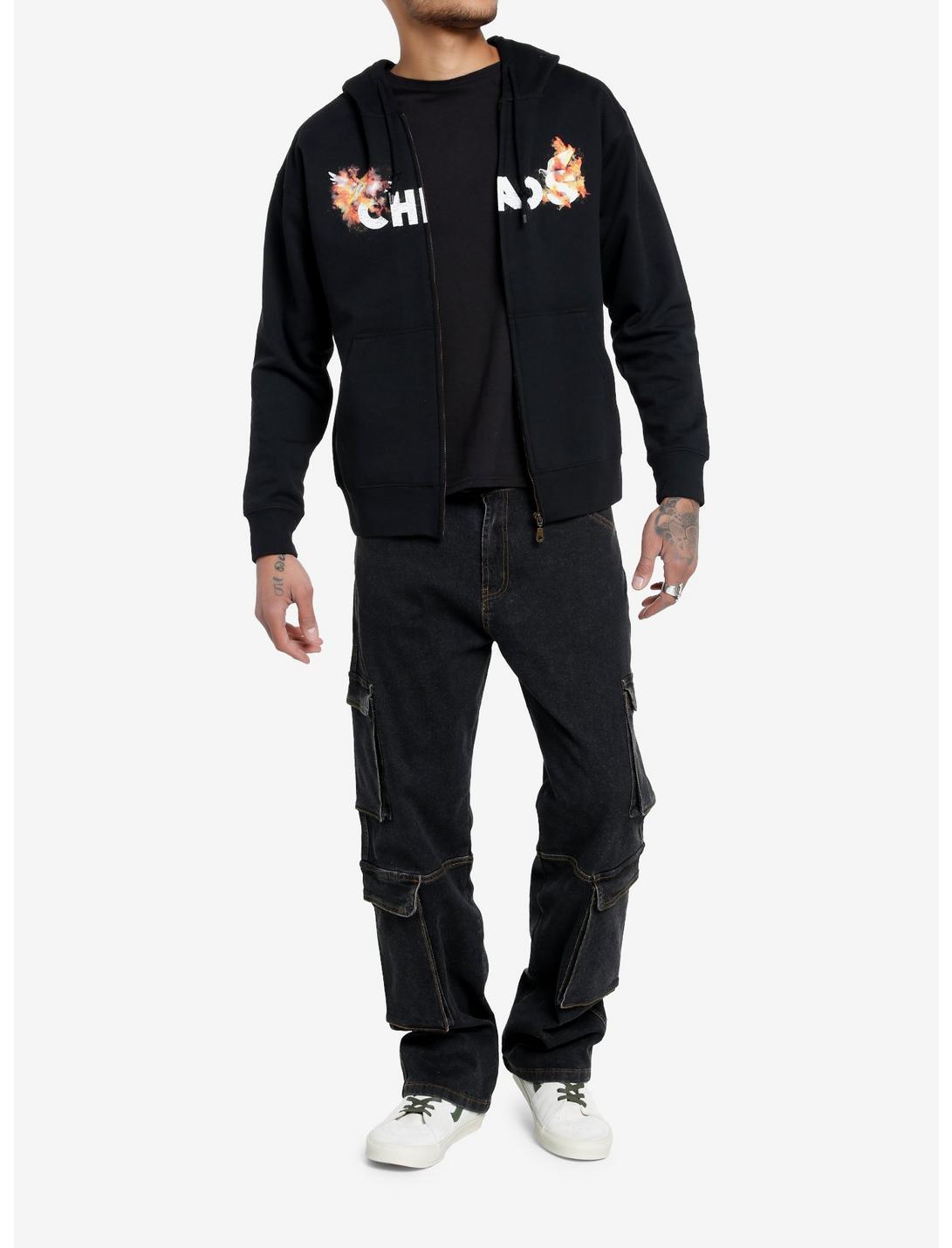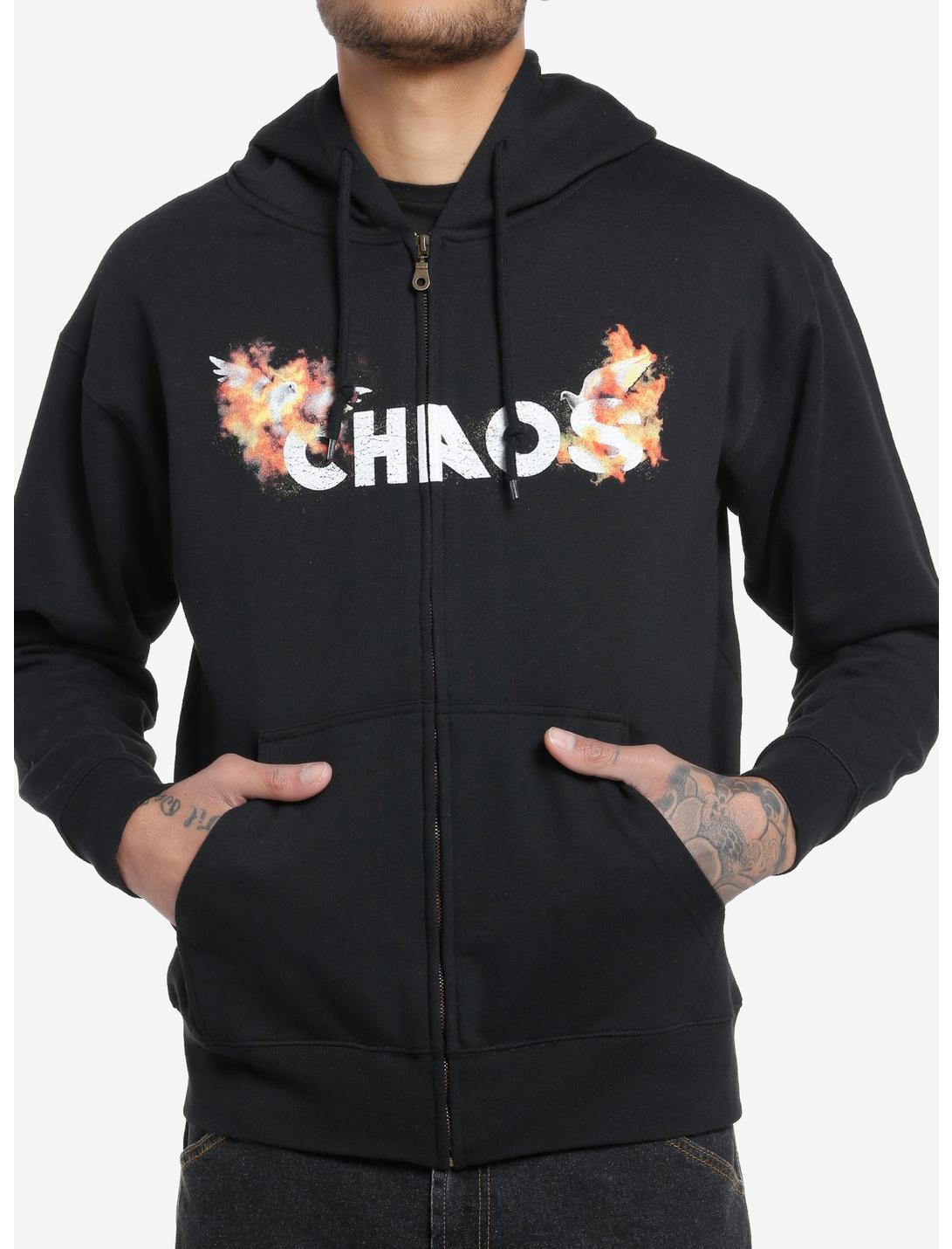 Ready for the end times? Grab this zip-hoodie with the word CHAOS and flaming doves on the front. On the back it says CHAOS, and "End of Times" and a large graphic of lightning, flames and doves. Front pockets and a drawstring hood.70% cotton; 30% polyesterWash cold; dry lowImportedListed in men's/unisex sizesModel is 6'1"Model wears size Medium