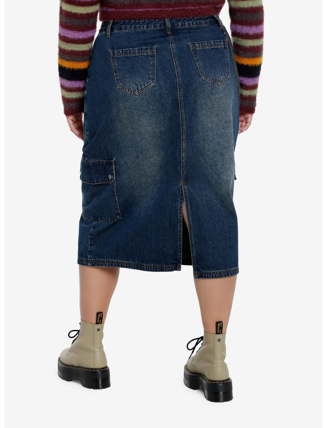 Social Collision Dark Wash Cargo Denim Midi Skirt With Chain Plus Size