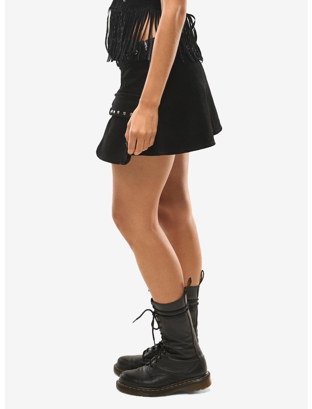 Wrangle up the cutest look in the wild west with this faux suede mini skirt! It features studs along the oversized cargo pockets and a decorative grommet O-ring belt.Please note: Style is fitted with no stretch; size up for a looser fit.Face: 100% polyurethaneGround: 100% rayonWash cold; line dryLength: 14"No stretchImportedListed in junior sizesModel is 5'10"Model wears size Small