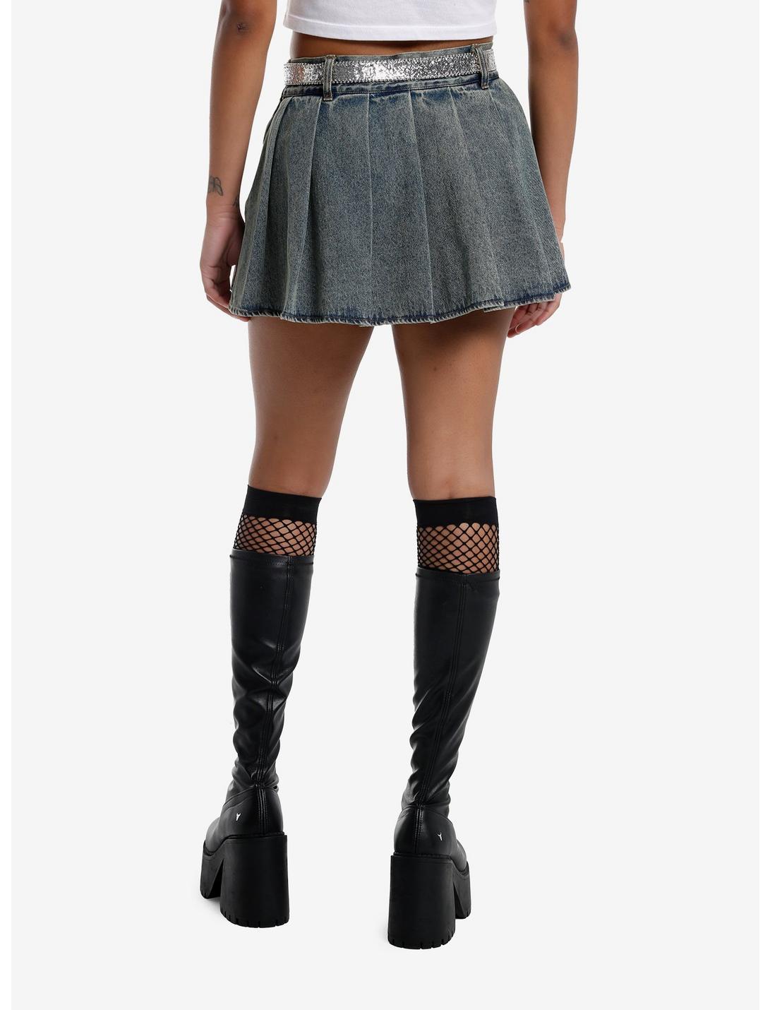 Social Collision Glitter Belt Denim Pleated Skirt