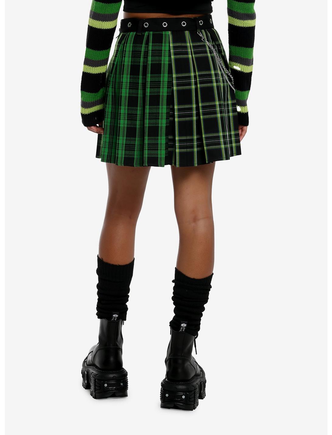 Hey, baddie! This pleated skirt is serving some serious attitude! Featuring split green plaid designs and a removable side chain. Comes with a black grommet belt.Please note: Style is fitted with no stretch; size up for a looser fit.65% polyester; 35% rayonWash cold; dry lowNon-stretch materialLength: 15''ImportedListed in junior sizesModel is 5'9''Model wears size Small